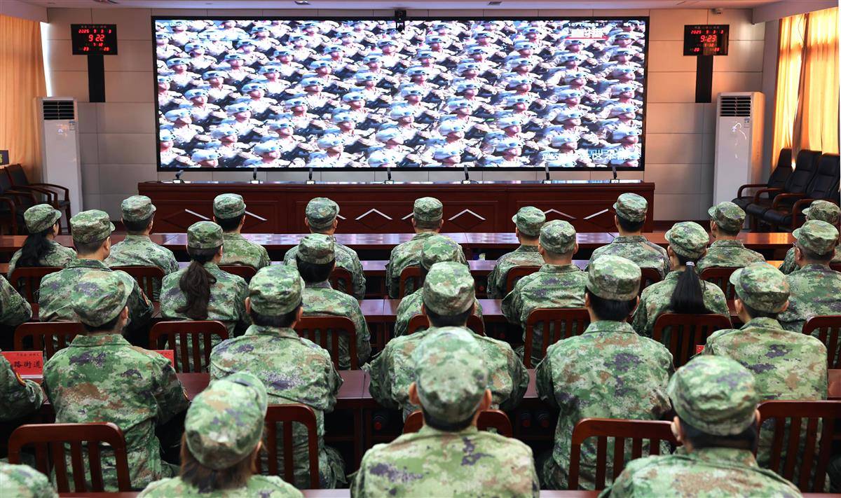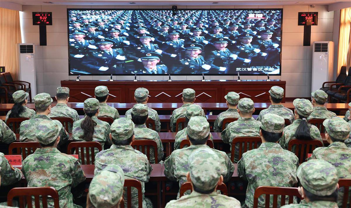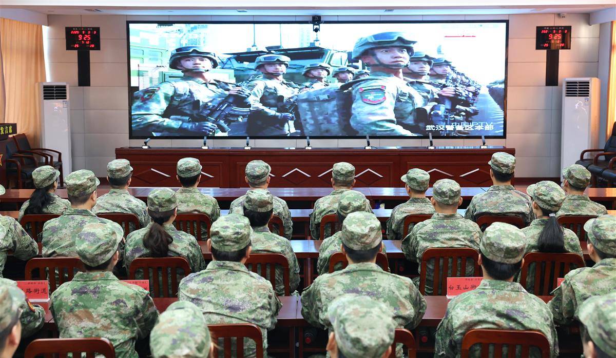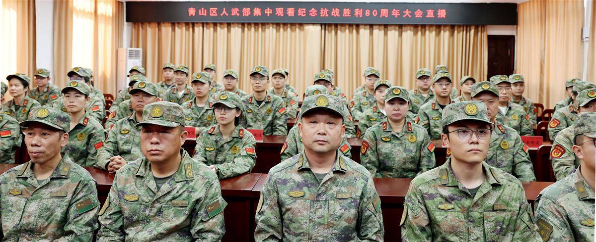 9月3日,武汉市青山区人武部组织干部和人武专干集中观看,纪念中国人民抗日战争暨世界反法西斯战争胜利80周年阅兵盛况。
