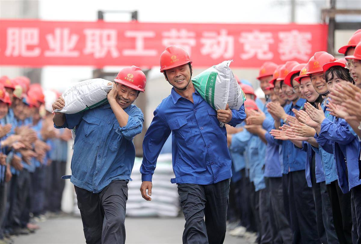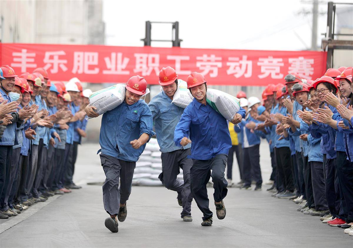 职工们正在进行一场紧张激烈的趣味化肥搬运比赛。
