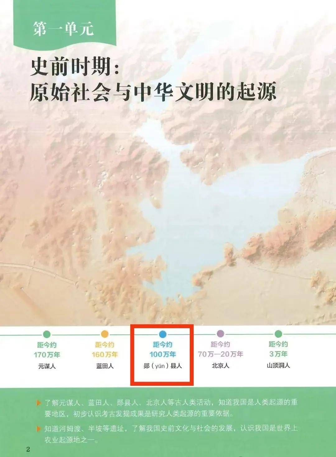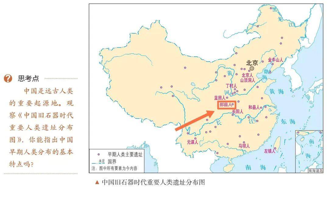 在该教科书第1课“中华文明的起源与早期国家”中的中国旧石器时代重要人类遗址分布图上,明确标示出“郧县人”。