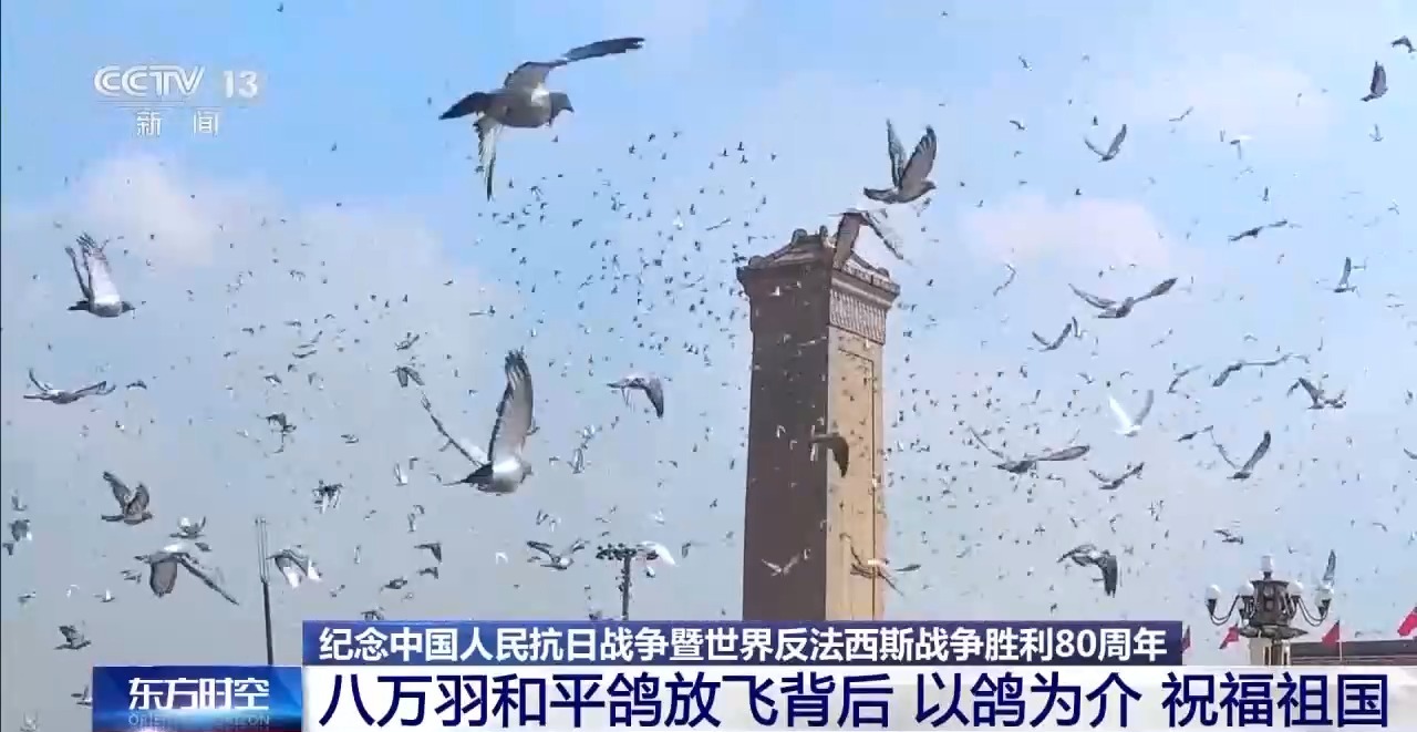 纪念抗战胜利80周年大会的结尾,8万羽和平鸽和8万只气球在天安门广场相继放飞,现场成为一片欢腾的海洋。这些鸽子来自上千个普通市民家中,象征着中国的和平力量,更承载着亿万普通民众对祖国和平繁荣的深情祝福。
