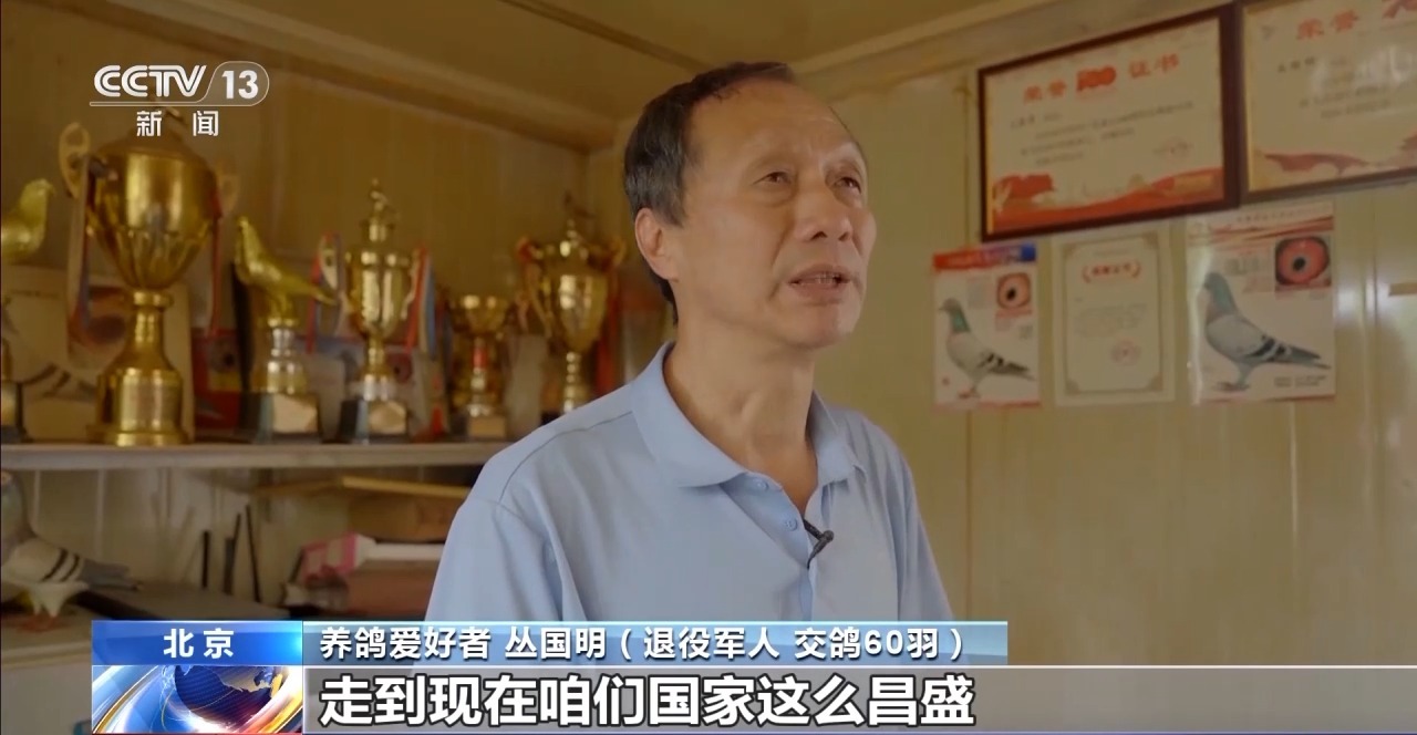 养鸽爱好者 丛国明(退役军人 交鸽60羽):最早一穷二白,走到现在咱们国家这么昌盛。我当兵的时候刚东风三号、东风四号,咱们现在什么先进的武器都有了。感到非常幸福和振奋,庆祝咱们国家昌盛、和平、稳定。
