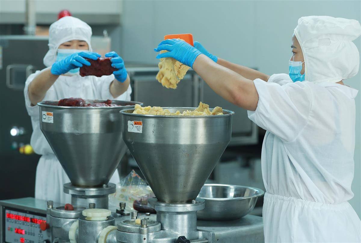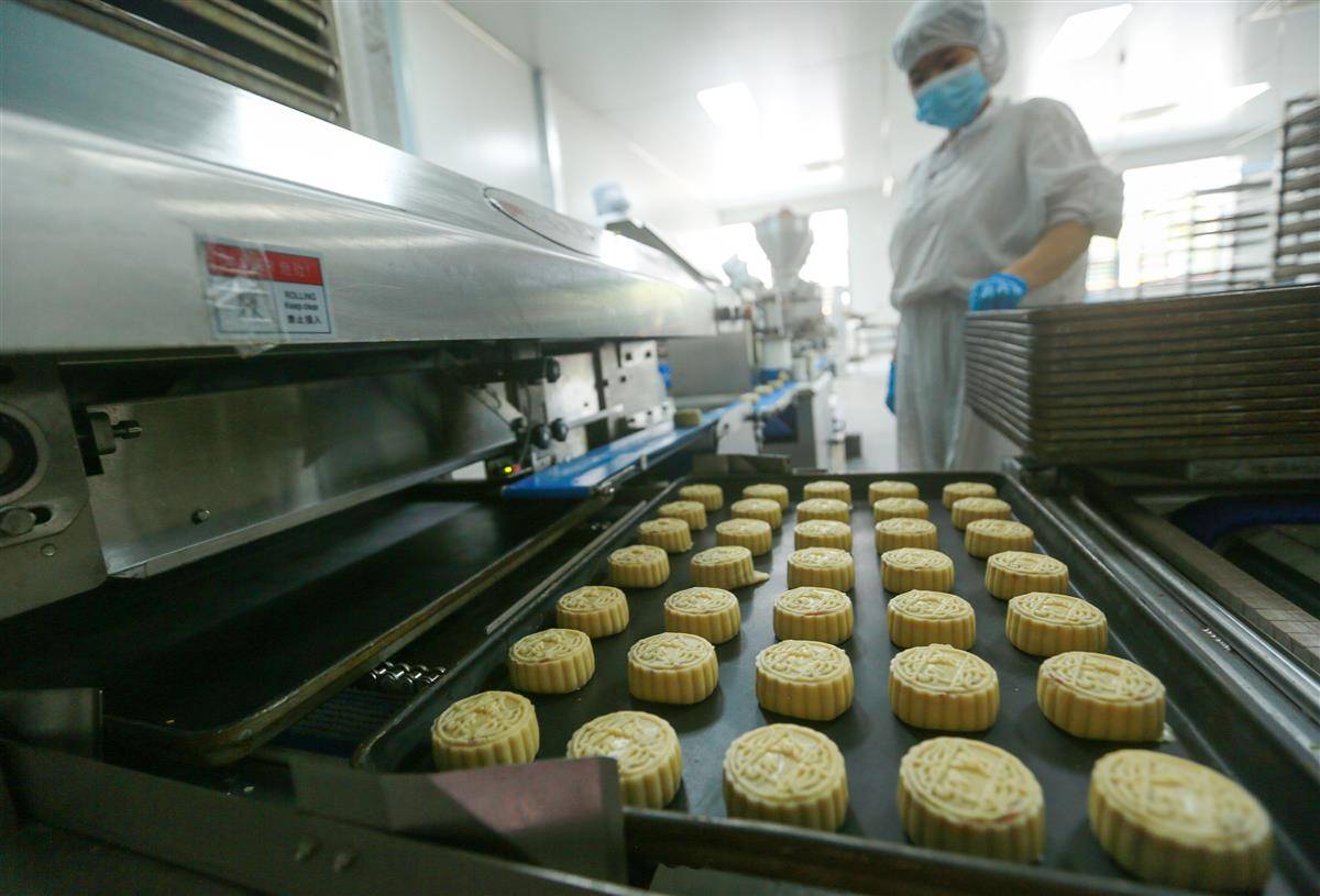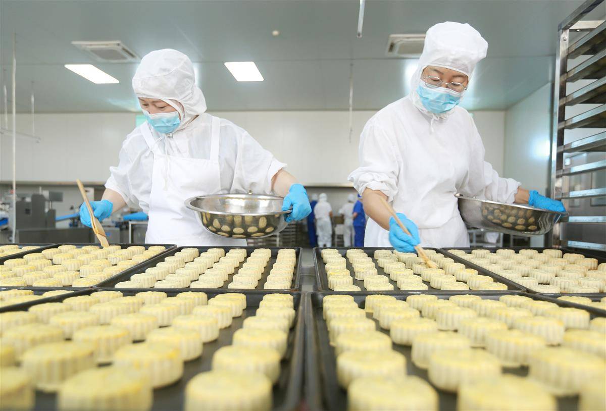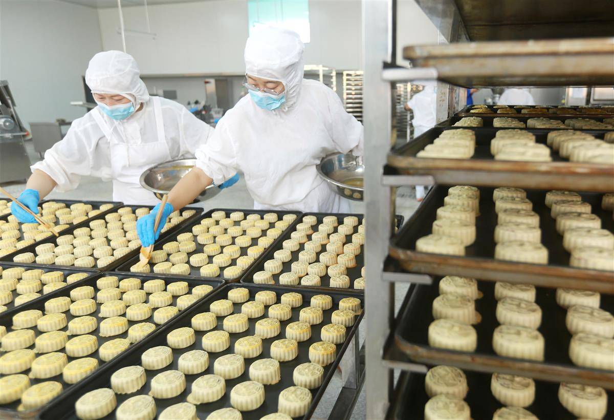 9月5日,秭归县屈姑国际农业集团工人在车间制作脐橙月饼。中秋临近,秭归县食品加工企业开足马力,加紧赶制脐橙月饼,供应节日市场。脐橙月饼是以脐橙果酱、橙皮丁等为馅料,经过多道工艺制作而成,以其果香浓郁、甜而不腻深受消费者喜爱。秭归是三峡库区脐橙种植大县,近年来,该县开发出脐橙月饼、脐橙酒、脐橙醋等系列新产品,以此提升脐橙附加值,延伸产业链条,形成果农增收、企业增效的双赢格局。(视界网 王罡 陈艳芳 摄)