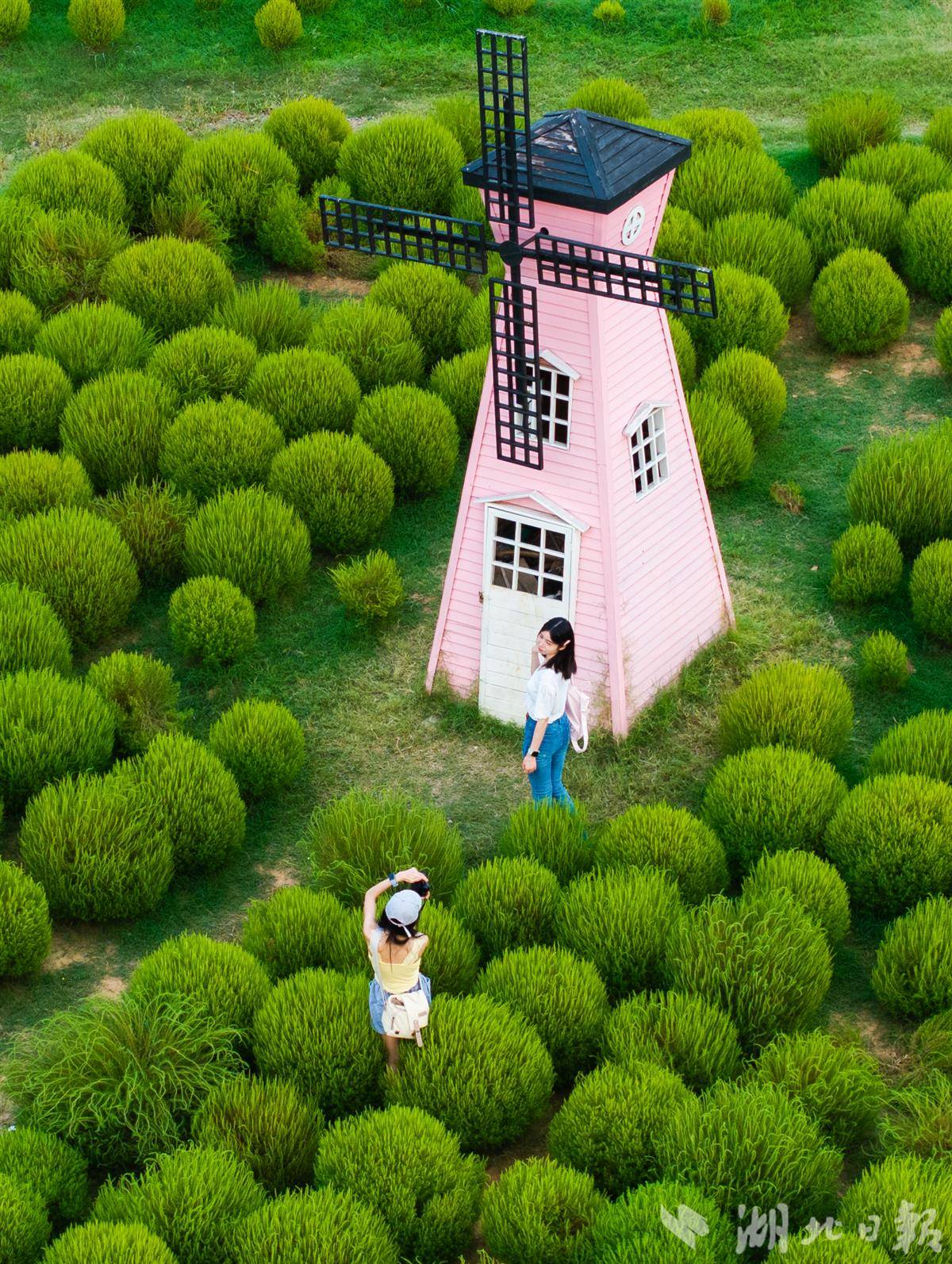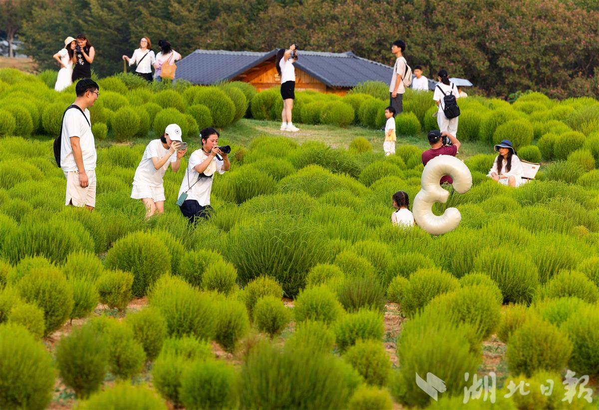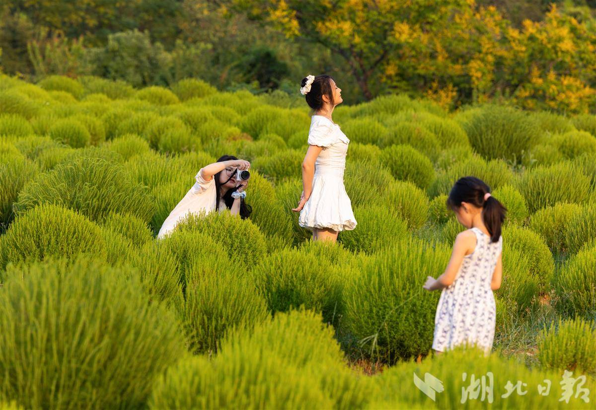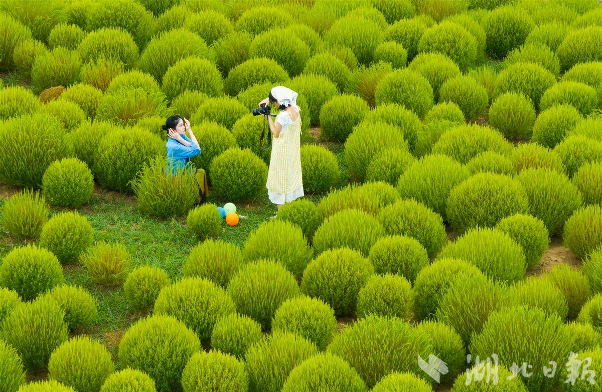 9月7日,武汉马鞍山森林公园,4万余株地肤草披上“绿衣裳”,吸引市民游客打卡游玩。预计9月底到10月初,地肤草将逐渐进入变色期,从青绿转向暖黄、橘红,届时会像打翻的调色盘。(湖北日报全媒记者 薛婷 摄)
