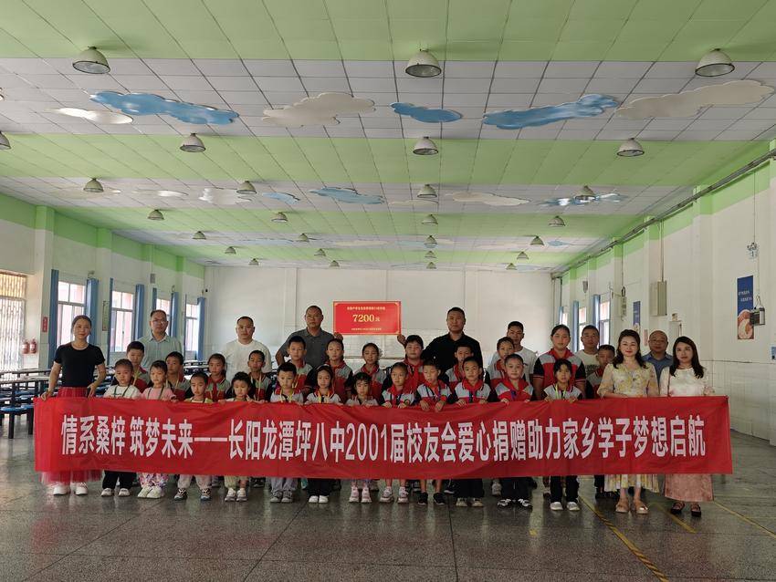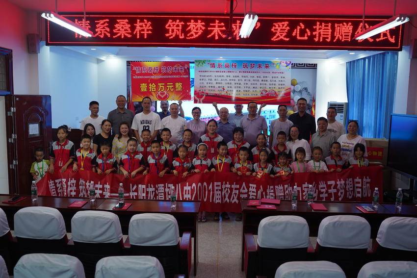 仪式上,龙潭坪八中2001届校友会向庄溪小学捐赠了笔记本电脑、LED全彩显示大屏、体育器材、无人机等设备,并为24名家庭困难学生发放助学金,物资与善款总价值约十万元。