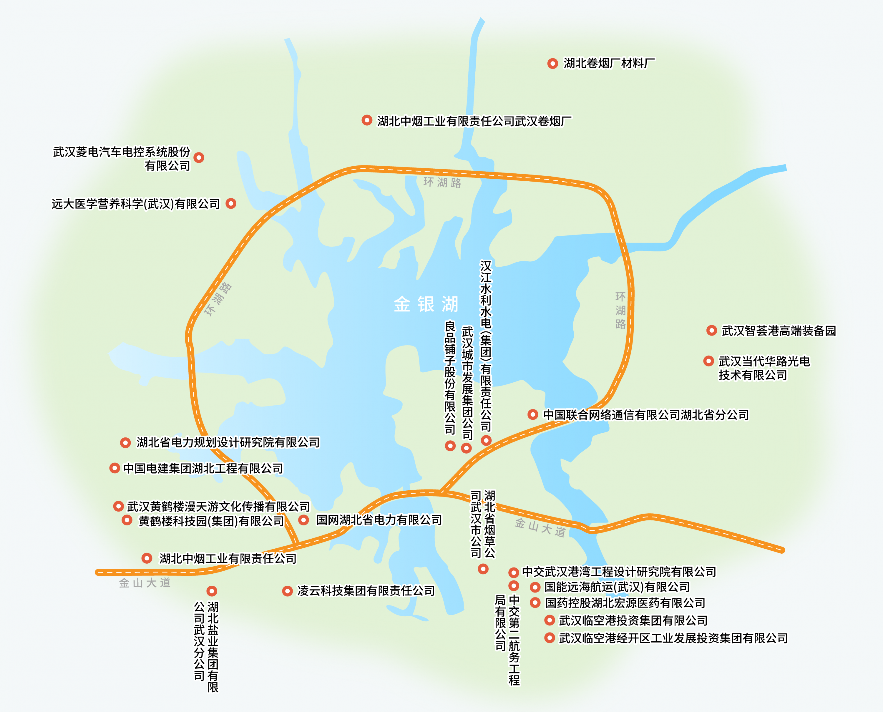 2000年,央企凌云科技集团率先落户金山大道旁,成为金银湖片区第一家总部企业。随后,湖北烟草物资有限公司、中交第二航务工程局有限公司、中国航天三江集团有限公司等大型企业纷至沓来。