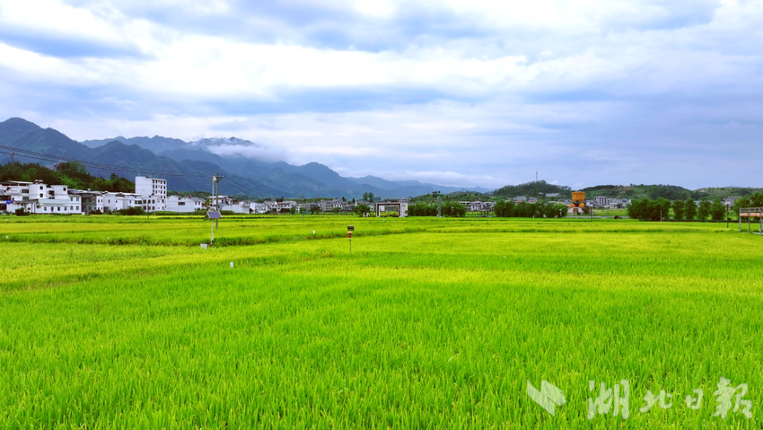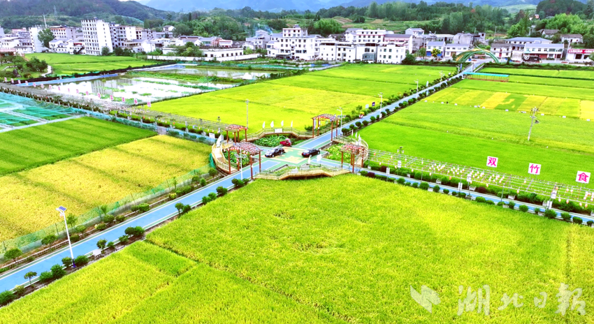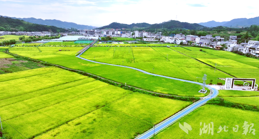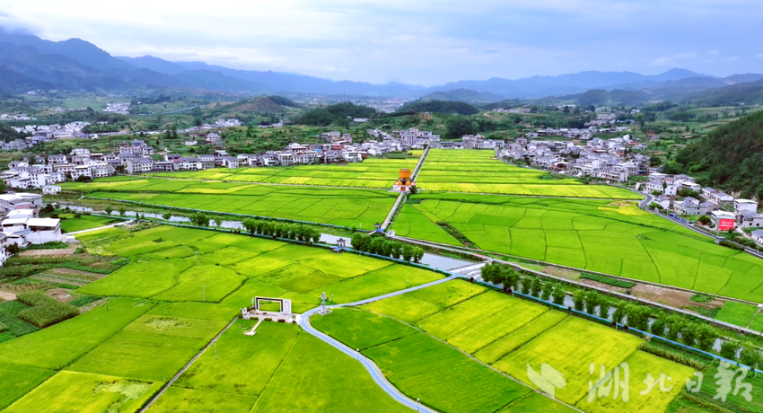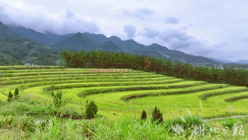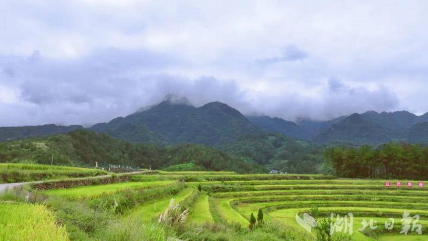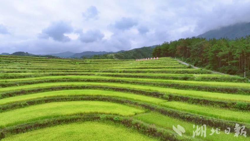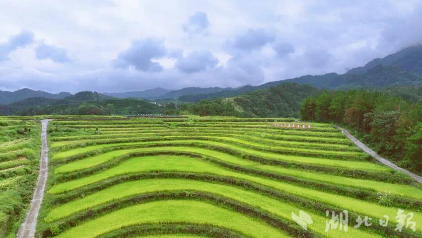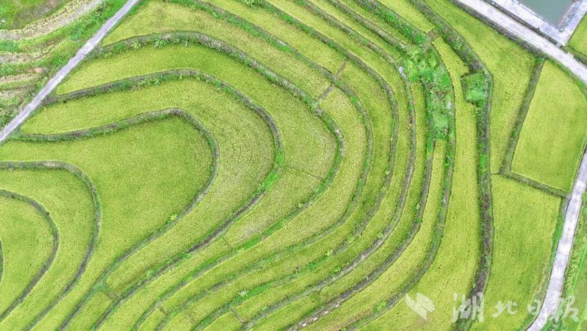 湖北日报客户端讯(通讯员涂慧、唐锐)金秋九月,正是稻浪翻滚、丰收在望的时节。走进竹溪县中峰镇,千亩贡米梯田依山而筑,层层金梯托起贡米香,顺着地势蜿蜒铺展,航拍之下,竟如一块块碧玉嵌在群山之间,规整得叫人惊叹,那绿也并非一味地浓,新秧是嫩黄掺着翠,老稻则泛着墨青,风一过,便层层叠叠地漾开波纹,整片梯田仿佛被秋风唤醒的绿绸,在群山中翩然舞动。