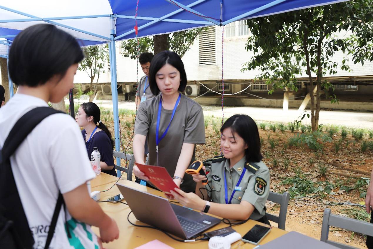 迎新当天,赵琳在大三学姐张岩的带领下,有条不紊地完成了报到流程:核验身份、缴纳费用、领取军装、测量头围、办理校园卡……每一步都透着军营特有的严谨。“这是你的军训帽,先试穿一下尺码是否合适;宿舍在1楼,6名女生住在一起,都是同一届的同学。”张岩耐心地讲解着。