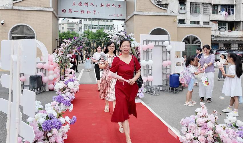校园内,每当有老师走近,孩子们便将精心挑选的鲜花递到老师手中。老师们在学生的簇拥下走向拱门,穿过花海,每一步都充满了仪式感。不少老师在此驻足合影,用镜头定格幸福的瞬间。