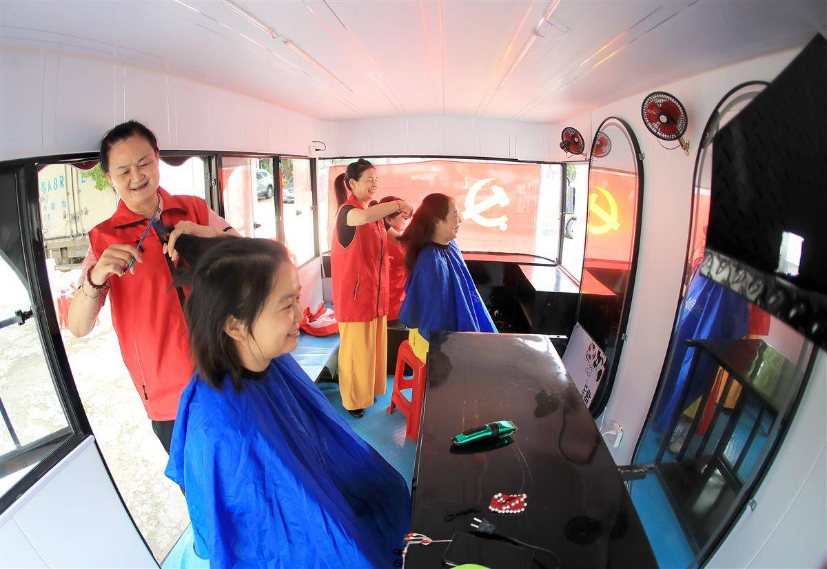 9月10日,在荆门市掇刀区白庙街道长源热电社区,党员志愿者驾驶“流动理发店”穿梭于辖区居民点,上门为行动不便的离退休职工和居民提供免费理发服务。