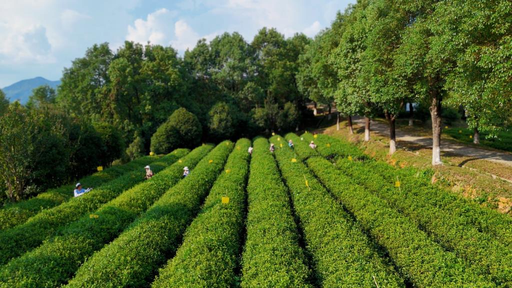 白霓镇的芽旗香茶园如一块绿绸铺展在山间,茶树修剪得齐整,茶农们挎着竹篓轻拨茶树叶片,查看秋芽饱满度。匠心守护的雅致,每一片秋茶的清甜,都藏着双手与大地的对话。