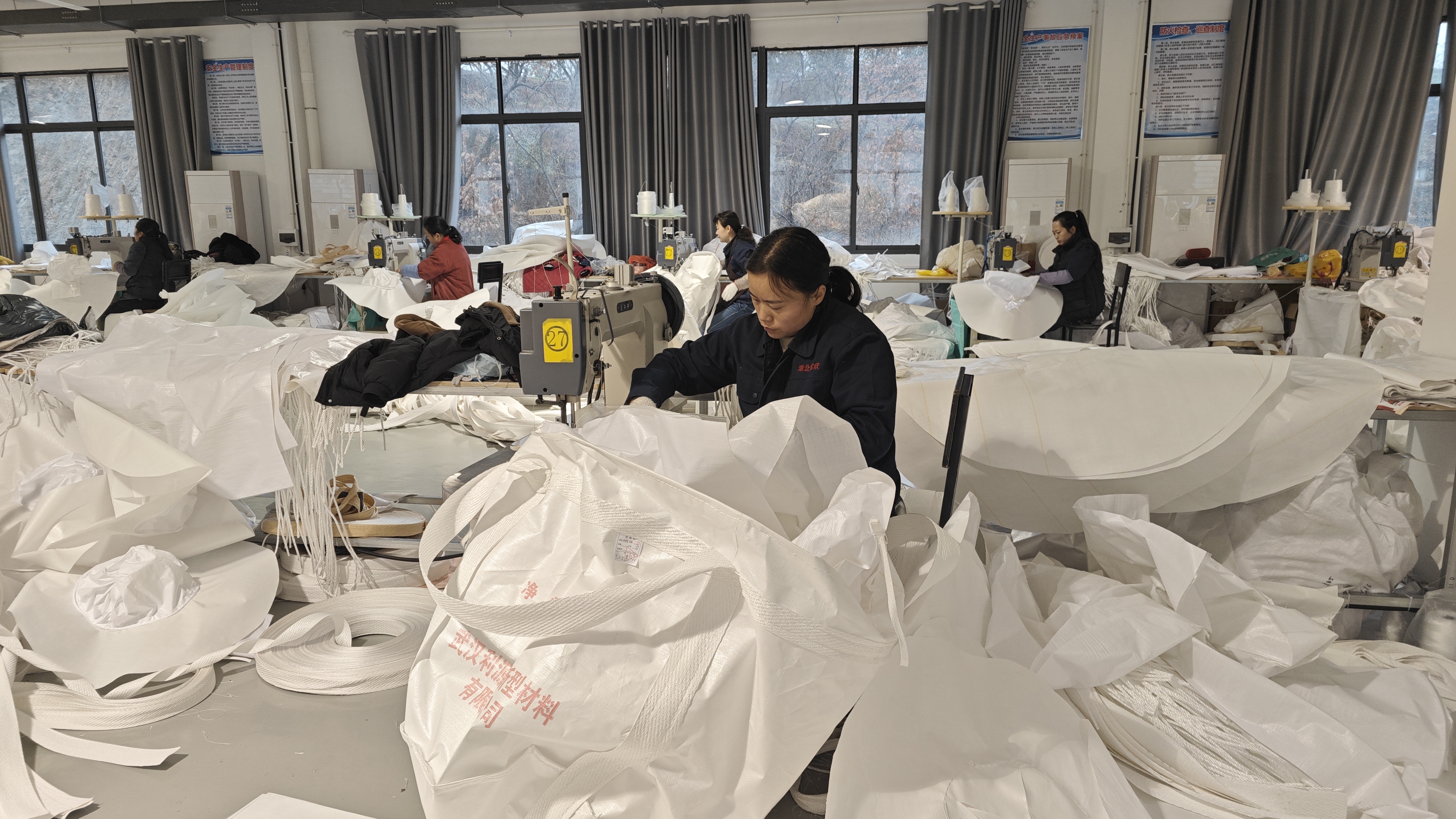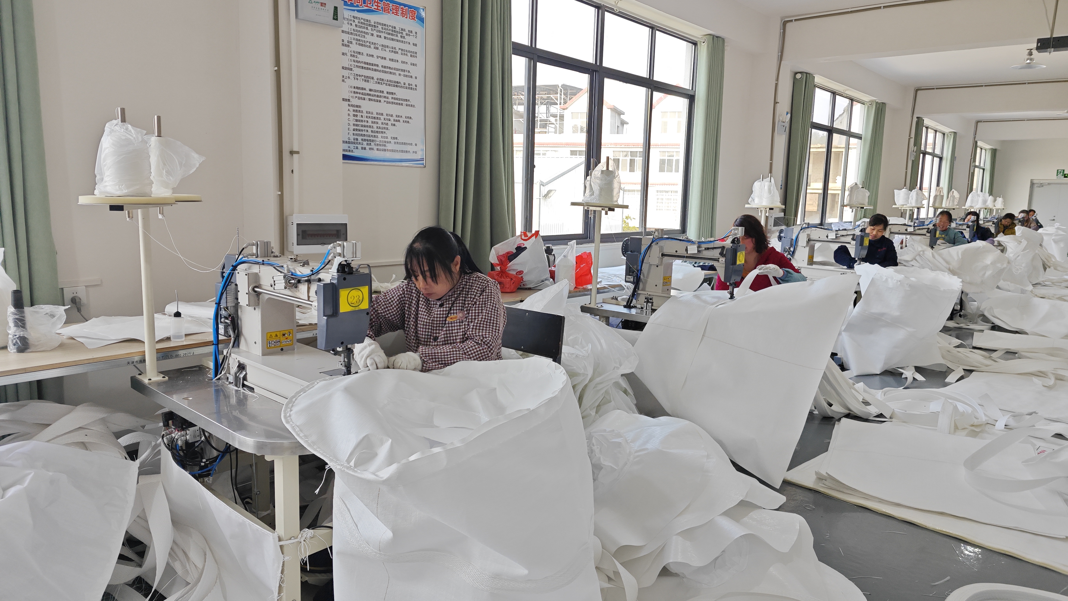车间主任董亚玲介绍:“目前40多人,每天生产500至1000条吨袋,订单排到10月份,供不应求。”