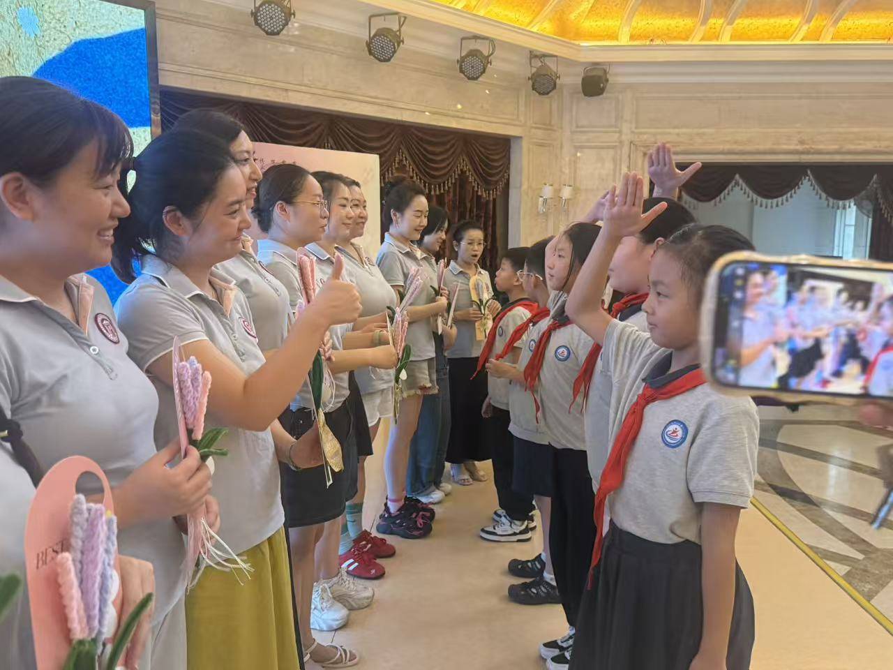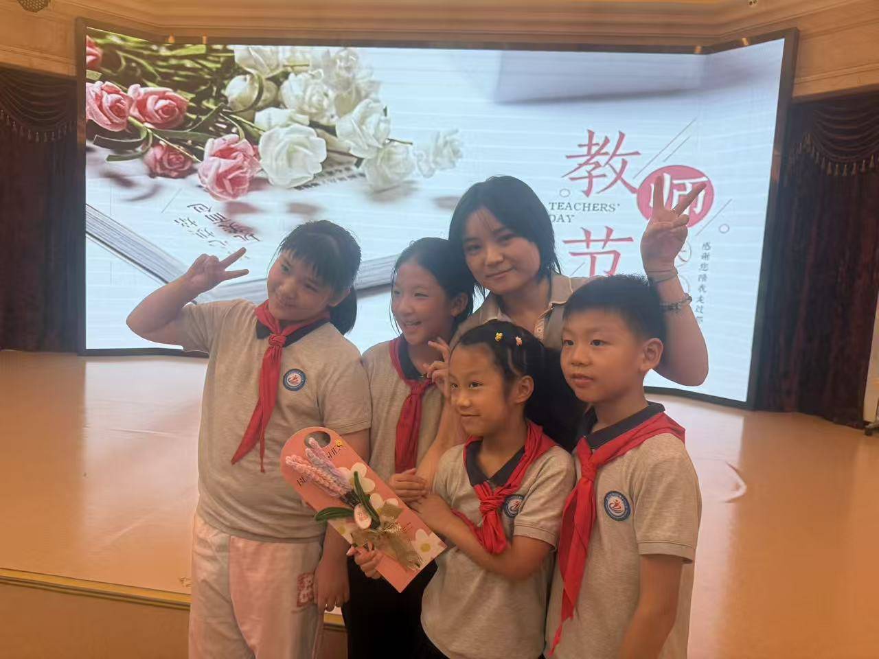 当学生代表声情并茂地朗诵《颂师恩》后,12名脸上写满崇敬的学生手捧精美的手工花,用一个个标准的少先队礼,恭敬地向教师代表献上节日礼物,表达对老师最纯真的感谢。