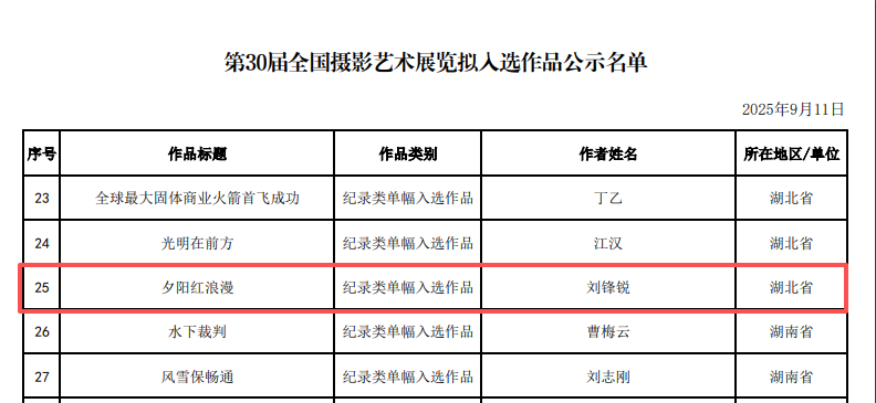由中国摄影家协会主办的第30届全国摄影艺术展览的评审工作已经结束,此次展览中湖北省表现亮眼,共有11件作品成功入展;其中,荆州市有2件作品脱颖而出,而咱们监利市更是凭借刘锋锐的《夕阳红浪漫》占据一席之位。谨致以热烈祝贺!