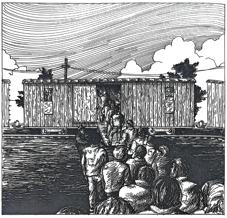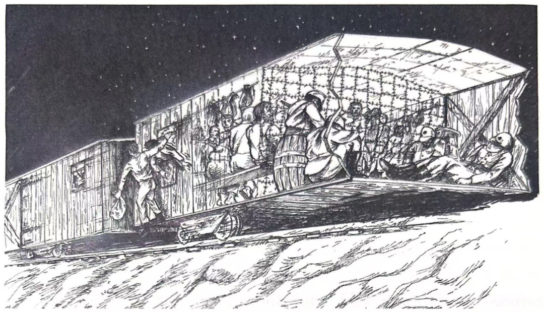 威廉·泰勒回忆录《被毛泽东营救》插画:战俘在中国上海被塞进货运车厢。