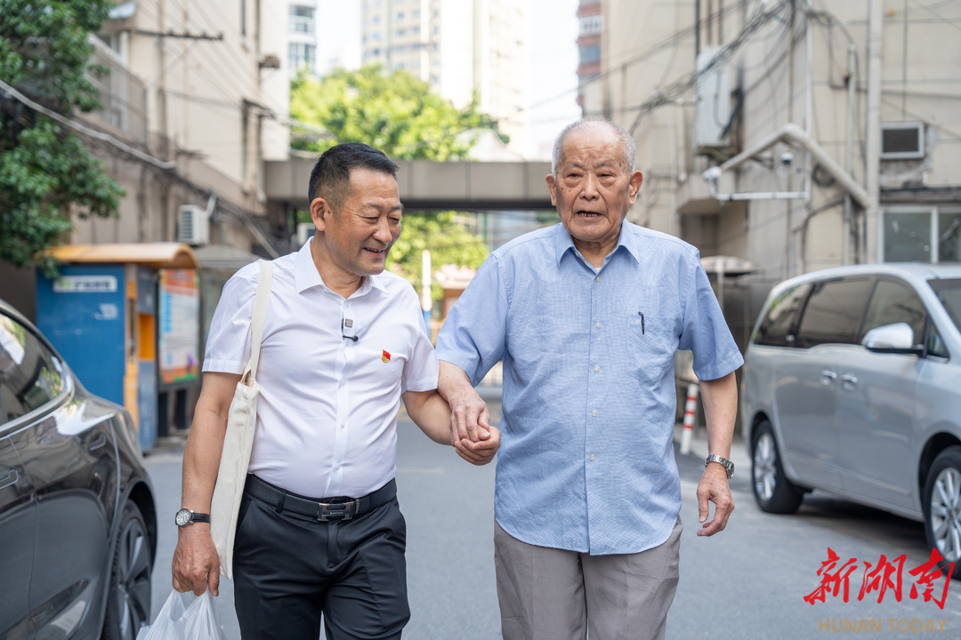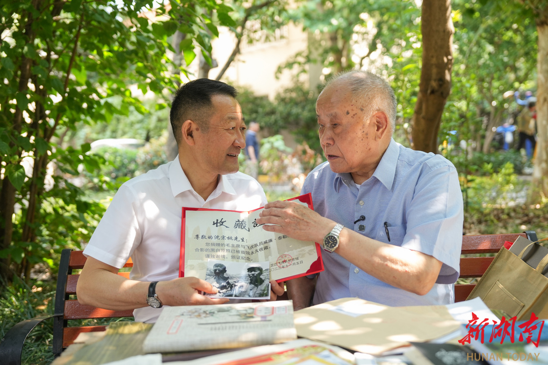 5月30日,吴建宏(左)在上海拜访沈宗桃,寻找照片背后的故事。湖南日报全媒体记者辜鹏博 摄