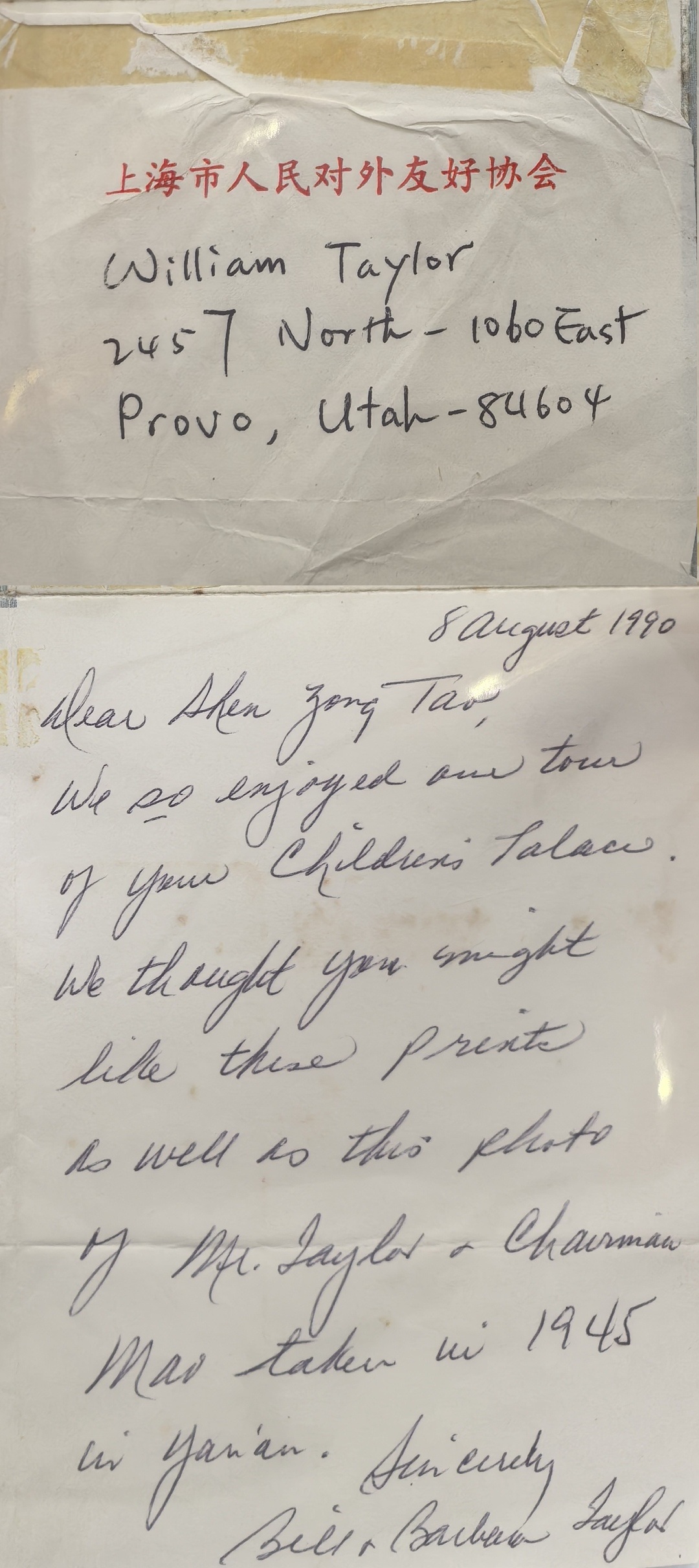 沈宗桃在来信中说,泰勒是抗战时期援华的飞虎队队员。1990年5月,泰勒携夫人芭芭拉访问上海时,曾到普陀区少年宫参观。时任少年宫主任的沈宗桃,热情接待泰勒夫妇。临别时,泰勒说,这也许是自己最后一次到访中国,回国后要把自己和毛泽东主席的合影寄给沈宗桃,请他世世代代保存下去。