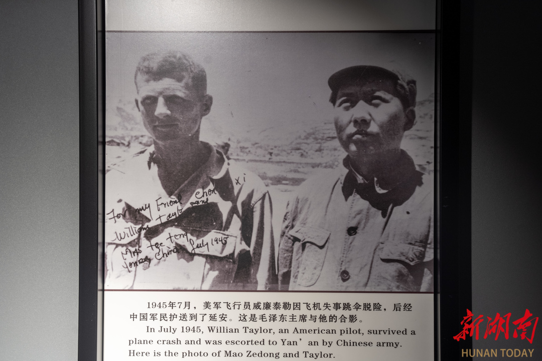 重庆史迪威博物馆的说明是:1945年7月,美军飞行员泰勒因飞机失事跳伞脱险,后经中国军民护送到了延安,这是毛泽东主席与他的合影。