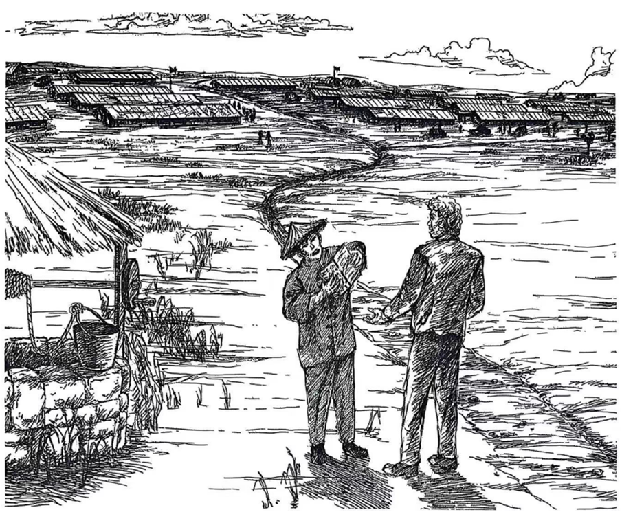 威廉·泰勒回忆录《被毛泽东营救》插画:威廉·泰勒尝试用手语和中国农民交流。