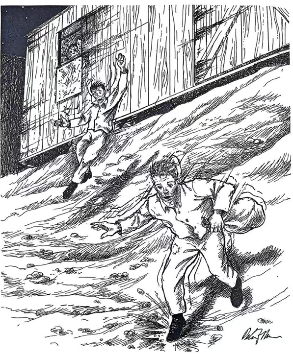 威廉·泰勒回忆录《被毛泽东营救》插画:威廉·泰勒和同伴先后跳下列车。