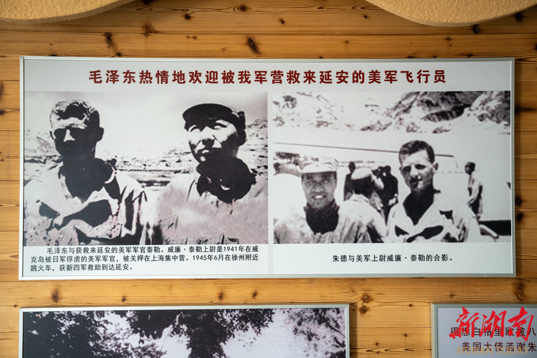 美军驻延安观察组驻地旧址的说明是:毛泽东与获救来延安的美国军官泰勒。泰勒上尉是1941年在威克岛被日军俘虏的美军军官,被关押在上海集中营。1945年6月在徐州附近跳火车,获新四军救助到达延安。