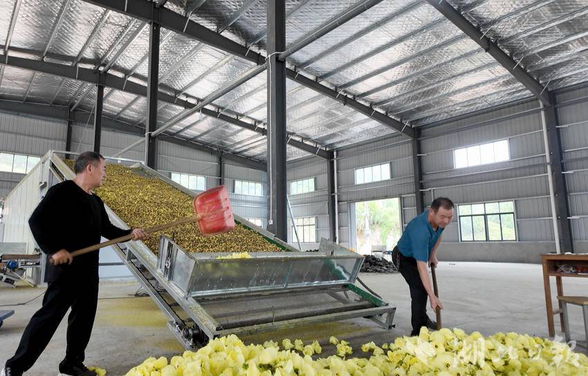 在基地旁的加工厂内,工人们分工明确,装卸、分拣、烘干、打包,流水线作业有条不紊。新鲜采摘的黄蜀葵花刚运到,便立即进入烘干环节,短短几小时就能转化为中药材原料。据生产线负责人丁证甫介绍,现在每天能产出5000斤黄蜀葵制品,都是按订单需求赶工,今年合作社已与苏中药业签订几十万斤订单,销路稳定。