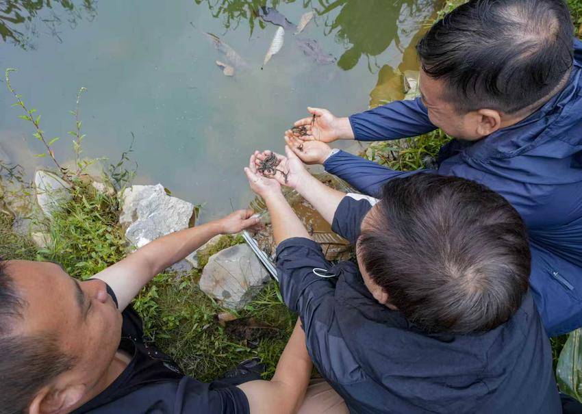 放归当日,工作人员提前对每尾亚成体进行健康检查,为它们做好标识登记,以便后续跟踪观测。看着小鲵们灵活地穿梭在水草间,翟永杰的脸上露出了欣慰的笑容,“希望通过我们的努力,能够让中国小鲵在长阳的绿水青山下永远存续下去。”放归过程中,大家没有贸然将小鲵直接投入环境,而是遵循“自然引导、循序渐进”的原则,让它们在靠近栖息地的缓流区域逐步适应,待其主动融入自然环境后,才完成最终的放归环节。