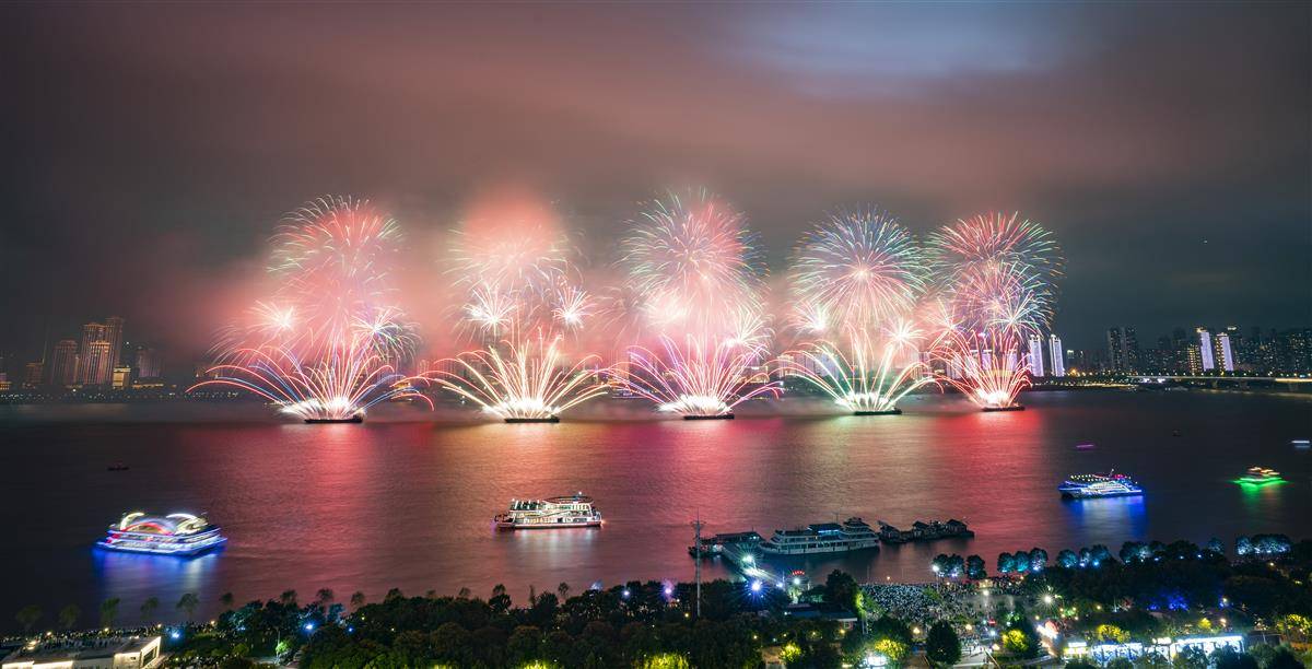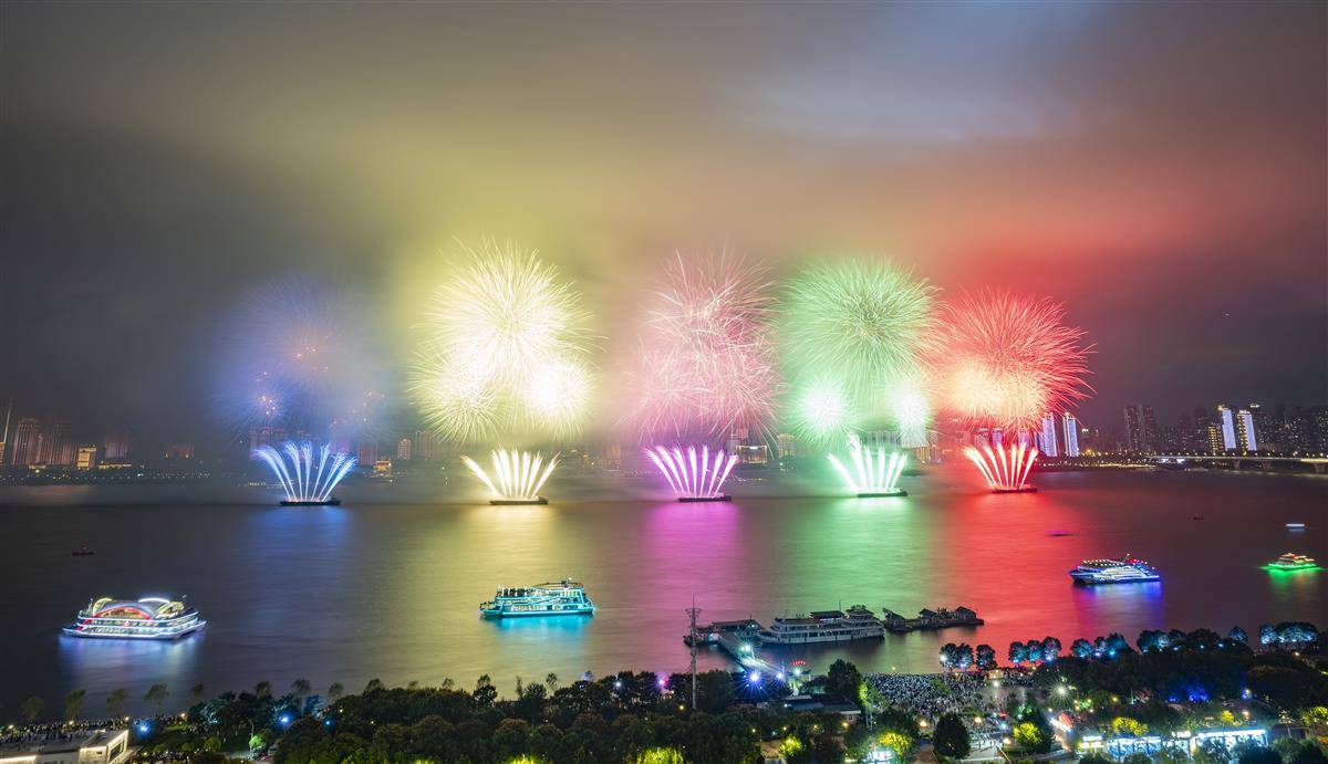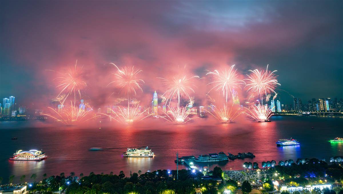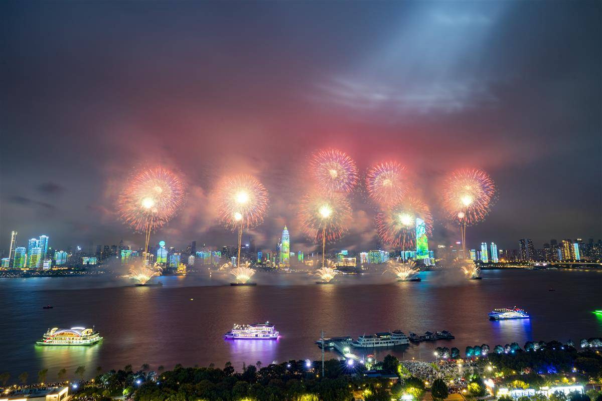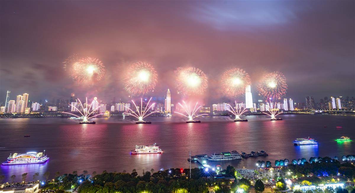 9月12日晚,美丽的长江又一次被璀璨的烟火表演点亮。当日,2025长江文化艺术季在武汉启幕。(湖北日报全媒记者 魏铼 摄)