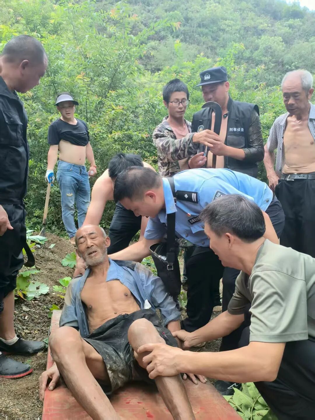 11时43分,众人终于在山沟最上方的水库旁看到了老人——王爹爹正虚弱地躺在一片茂密的草丛中。万幸的是,他还有生命体征,头脑也还算清醒,身上依旧穿着那件带补丁的蓝色衬衣。