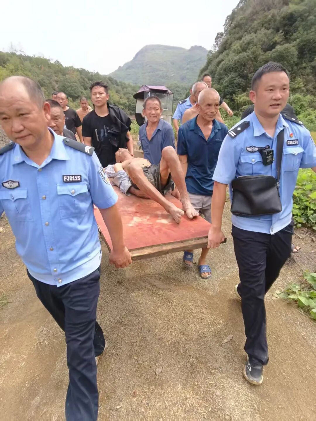 由于老人身体虚弱无法行走,救援人员立刻找来木板制作简易担架。众人齐心协力,一步步将老人安全抬出山林,送上前往通山县人民医院的救援车。
