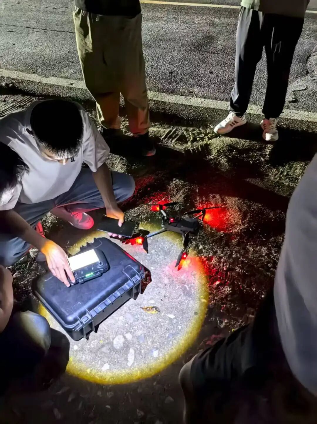 乐尧带领民辅警兵分两路,一路沿着老人走失的106国道沿线排查,挨家挨户询问过往村民与商户;另一路则带着热成像无人机,对国道旁的山林区域进行空中侦察。镇政府工作人员与民警一同穿梭在路边草丛与山间小径中。