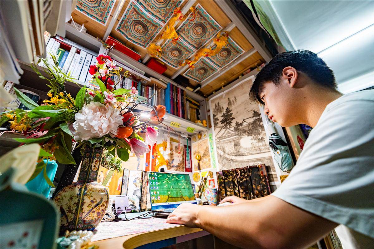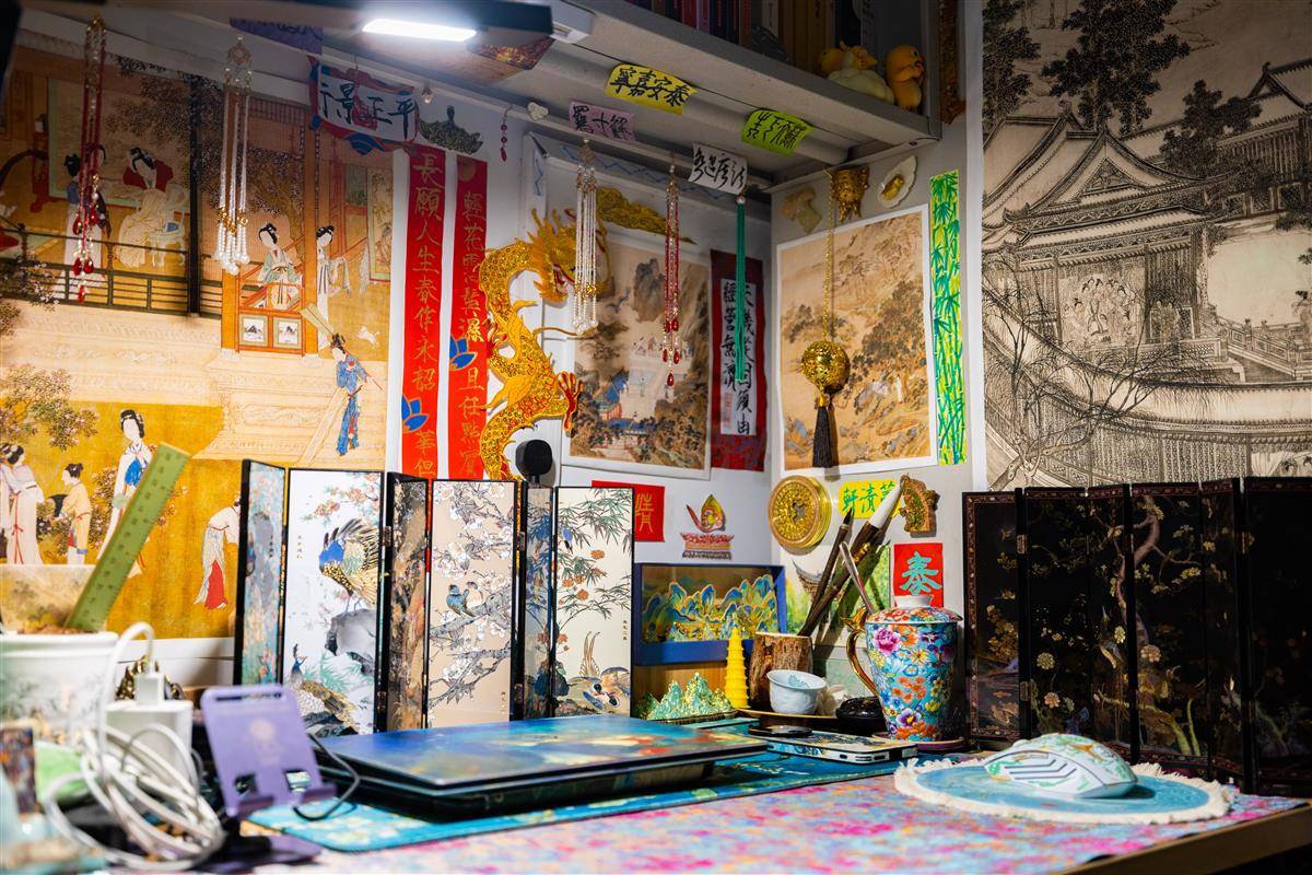 2025年9月14日晚,湖北日报全媒记者实地探访了华中科技大学经济学院2024级经济创新专业学生覃于子瑞的寝室,一步入寝室,青花瓷、国画、书法等各类装饰及工艺品印入眼帘,古色古香,如同一间小型的文人书斋,屏风、瓷器、书画环绕其中,宛如一处微缩的东方艺术馆。据了解,覃于子瑞花了9个月的时间,陆陆续续把寝室“爆改”成现在这样,他从小就热爱中国传统文化,初高中时就成为了中华诗词学会会员,抚州市传统文化促进会文昌书院荣誉院长,江西省诗词学会会员,乐平市诗联曲协会会员。课余时间,他投身诗词曲、辞赋、文言文、古歌,戏曲等文体创作,喜好鉴赏国画、中国古建筑,能笔小篆九叠篆、金文、隶书、楷书瘦金体、草书等书法,对中国服装、器物、纹样同样有所涉猎。目前写有超过二百四十余首诗词,九篇辞赋,二十余篇古典文章,小部戏曲。(拍摄/剪辑:湖北日报全媒记者 何宇欣 实习生 何抒澄 )