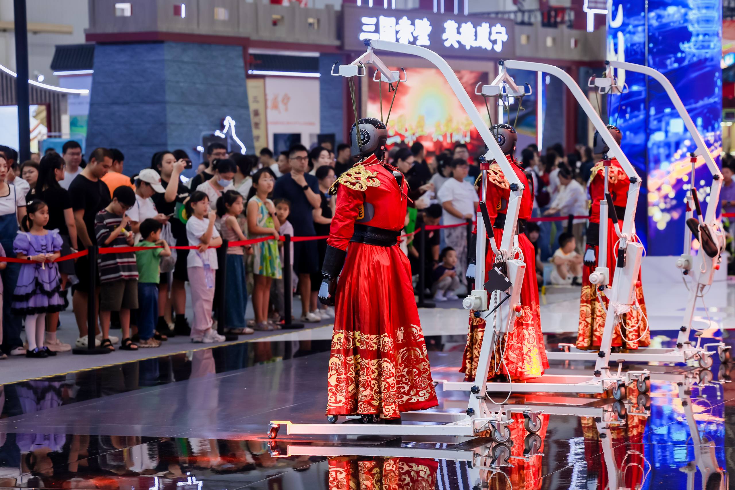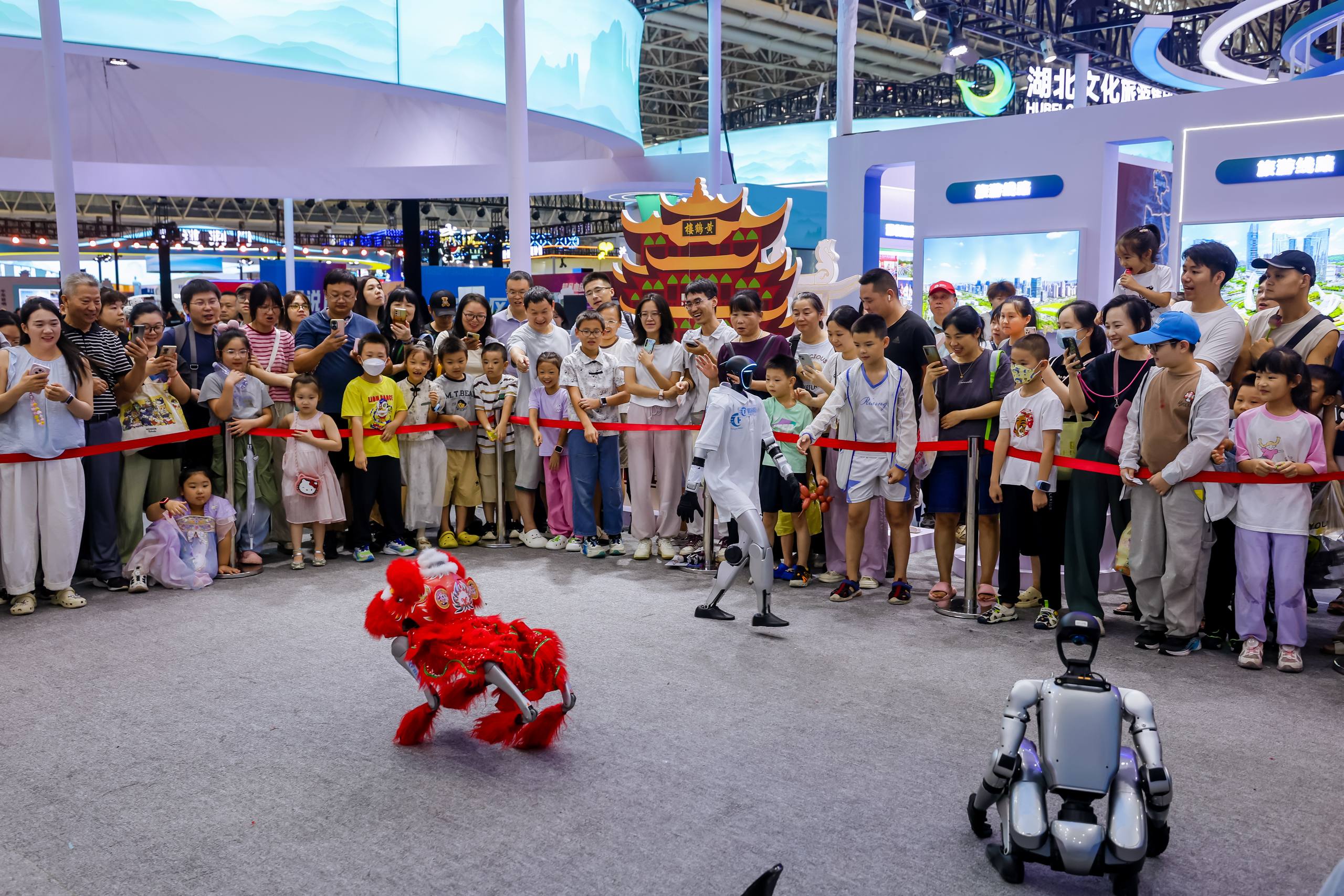 文旅产业博览会现场,观众围观机器人、机器狗表演。