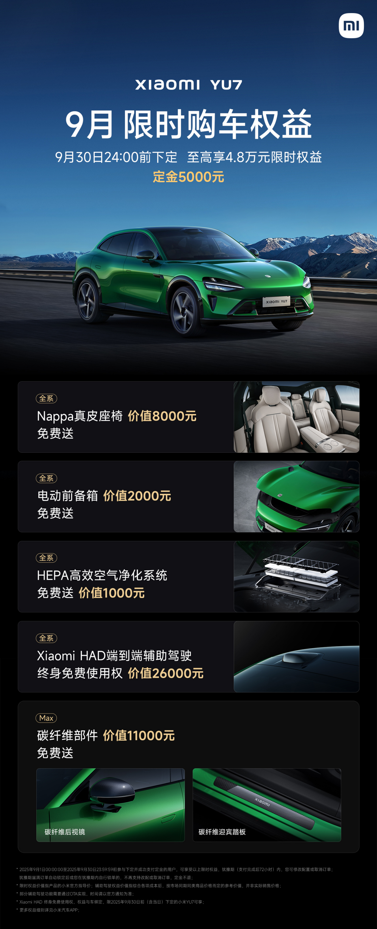 根据小米汽车官方发布的9月限时购车权益,小米YU7将免费赠送Nappa真皮座椅+电动前备箱+ HEPA空气净化系统。此外,Max版将额外赠送碳纤维后视镜+迎宾踏板。同时,Xiaomi HAD端到端辅助驾驶终身免费。