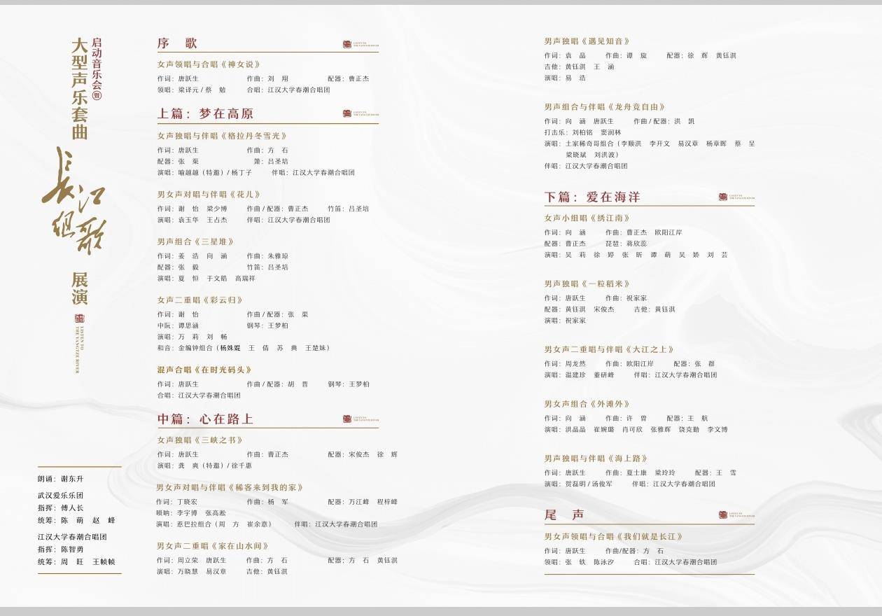 据悉,本届音乐周,还将轮番上演各种不同主题和风格的音乐会。“武汉音乐学院大型民族管弦乐作品音乐会”将传统编钟与现代民族管弦乐相融合,刻画荆楚大地盛世美景、展现广大人民的浪漫气质与精神风貌。“优秀民族歌剧选段音乐会”汇聚了全国知名歌唱家、中国音乐金钟奖获得者等优秀演员,演绎《洪湖水浪打浪》《小二黑结婚》等经典歌剧选段和《八月桂花遍地开》《天使日记》等优秀歌剧选段。“《长江》原创交响作品音乐会”将以交响序曲、钢琴协奏曲、交响诗与交响曲等多种形式,奏响长江的壮美气象与深厚底蕴。“闭幕音乐会暨长江主题合唱作品展演”,汇聚多支知名合唱团,共同绘就一幅跨越时空的音乐长卷。《长江之歌》以雄浑之声勾勒大江奔涌;《康定情歌》等民歌瑰宝,轻吟长江风情;《太阳出来喜洋洋》等时代旋律,唤起来自岁月的温暖共鸣。