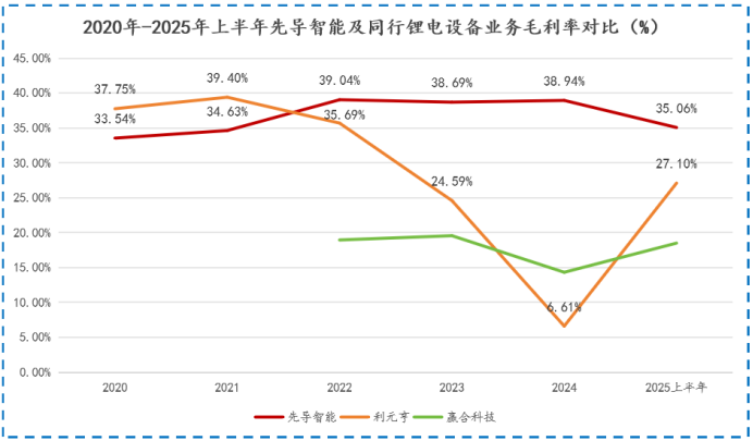2020年-2025年上半年,先导智能锂电设备业务毛利率基本维持在35%以上的较高水平,远超细分设备龙头赢合科技。