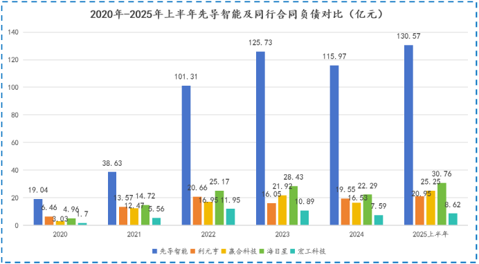 定金部分则基本列在公司财报的“合同负债”栏中,2025年上半年,先导智能合同负债总额高达130.57亿,比利元亨等四家同行加起来都要多。