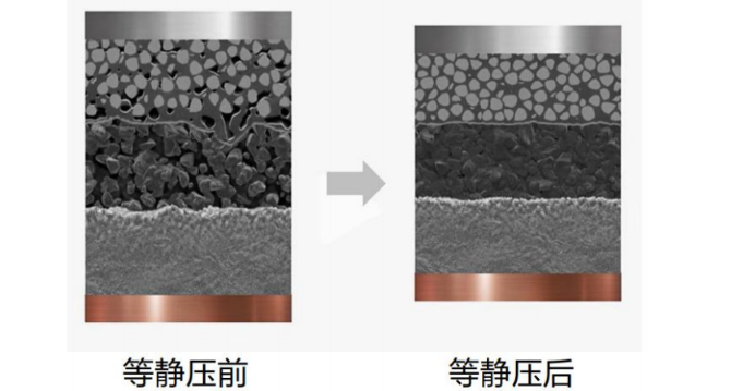 等静压设备的出现就完美解决了这一问题,一个85℃、500MPa的等静压设备就能实现固-固界面95%的致密度,碾压传统辊压技术(致密度通常低于85%)。