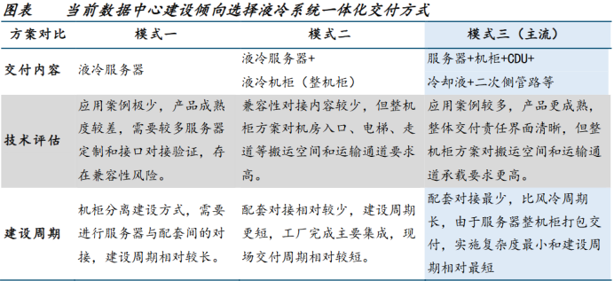 在“功耗提高+PUE政策”双重压力下,各大数据中心认识到,相比“液冷服务器”或“液冷服务器+液冷机柜”这类解耦化的交付方案,“又快又省”的一体化方案更符合当下市场需求。