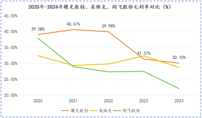 产品附加值的差异也体现在三家公司的盈利能力上。2020年-2024年,具备浸没式液冷高附加值技术的曙光数创综合毛利率每年都超30%,比英维克、同飞股份都要高。