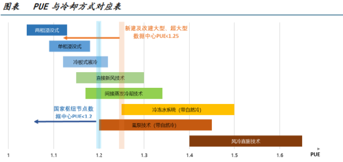 数据中心的制冷技术更新路径大致为:风冷→冷板式液冷→单相浸没式液冷→两相浸没式液冷。从左到右对应的PUE越来越低,技术附加值自然也越来越高。