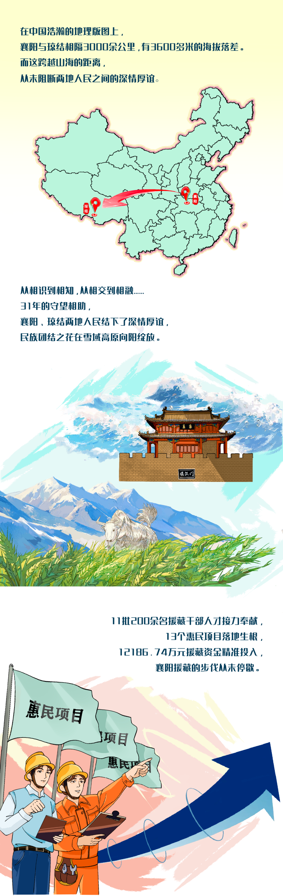 11批200余名援藏干部人才接力奉献;13个惠民项目落地生根;12186.74万元援藏资金精准投入......襄阳援藏的步伐从未停歇。从相识到相知,从相交到相融,31年的守望相助,襄阳、琼结两地人民结下了深情厚谊,民族团结之花在雪域高原绚丽绽放。