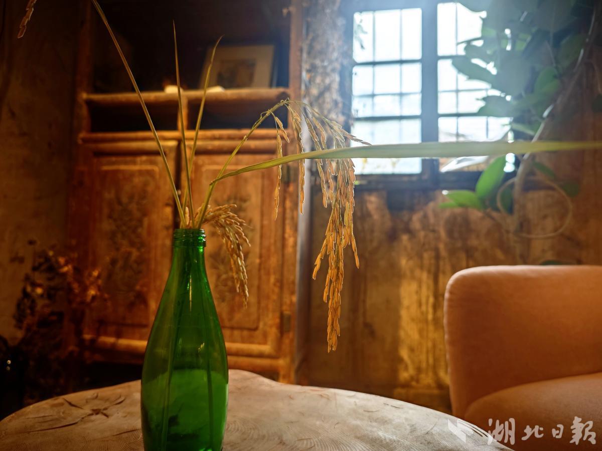 邓家门32号占地面积不大,但仍然保留着三进式院落格局。客人从过径门而入,便进入小院,院内有凉棚、竹椅可供休憩。再往前,是洞开的大门,锈迹斑斑的门钹上,挂着一串柿子。柿子是从附近嵩阳山上采摘的,“不同的季节,我们都会布置相应的乡土元素。”胡娟说。临近秋稻丰收,咖啡桌上的花瓶里,也插上了金黄的稻穗。