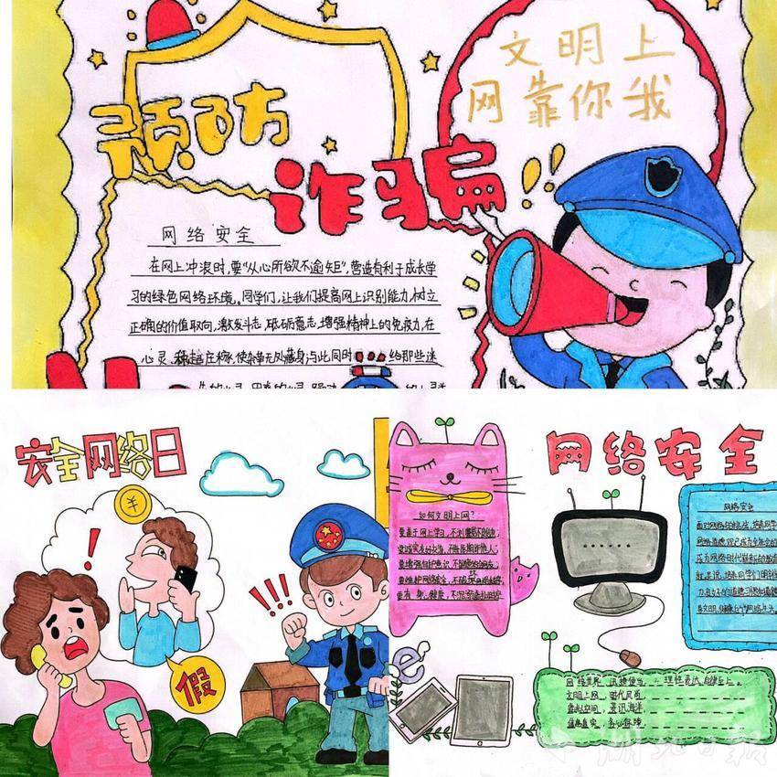 活动中,同学们聚焦“反诈科普、文明上网、信息保护”等关键领域,创作出一批主题鲜明、形式活泼的手抄报作品:有的以“110反诈宣传”为核心,绘制民警宣讲、反诈热线等场景,将“陌生链接不点击、可疑来电不轻信”等反诈口诀融入其中;有的设计“网络安全知识手册”板块,用卡通化的电脑、手机形象搭配“绿色上网、理性表达”的文明用网倡议;还有的还原了“虚假中奖”“冒充客服”等常见诈骗套路,以生动画面警示网络风险。