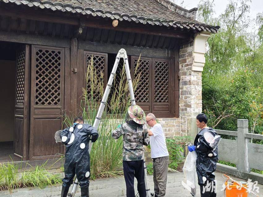 为及时消除隐患,均县镇政府迅速协调丹江净乐居有害生物防治公司专业团队开展作业。工作人员身着专业防护装备,携带专用工具,对两处建筑的蜂窝进行全面排查与精准清除。作业过程中,团队严格遵循文物保护规范,以科学、安全的操作方式,确保文物建筑本体不受丝毫损伤。