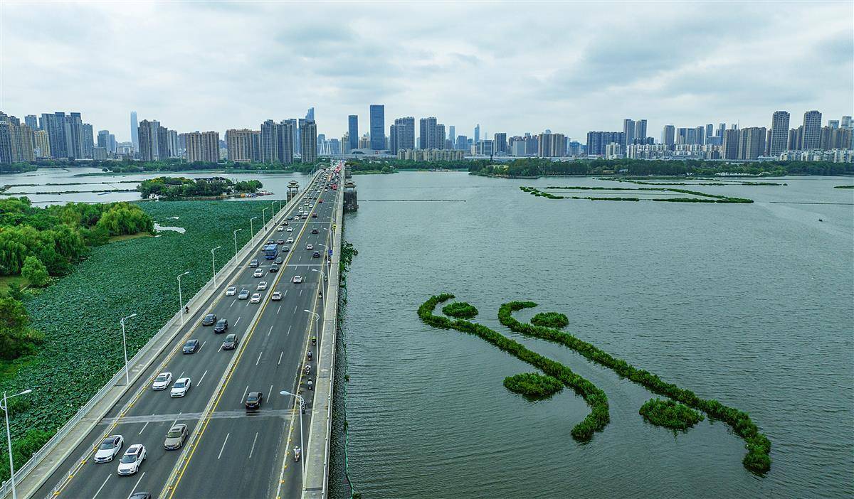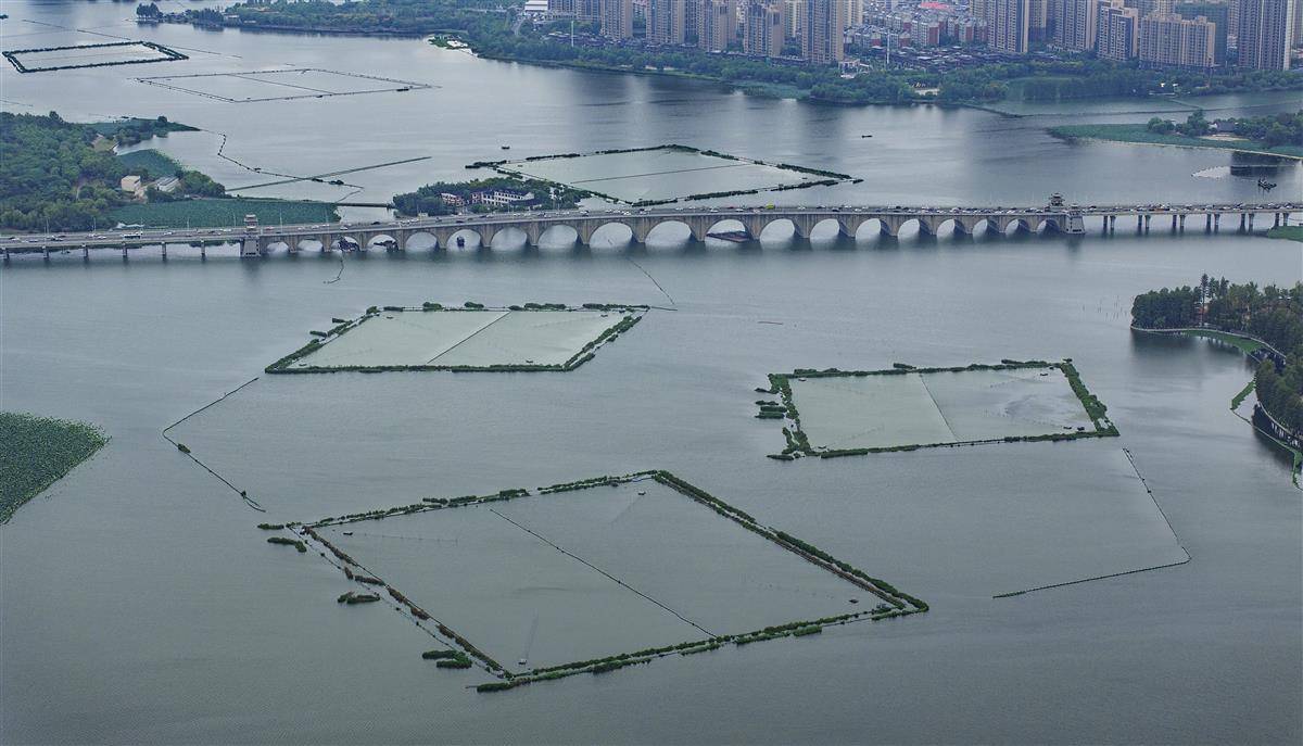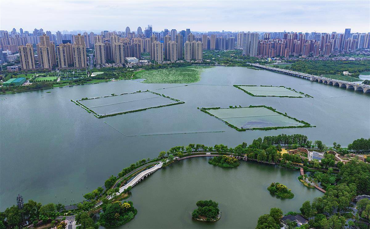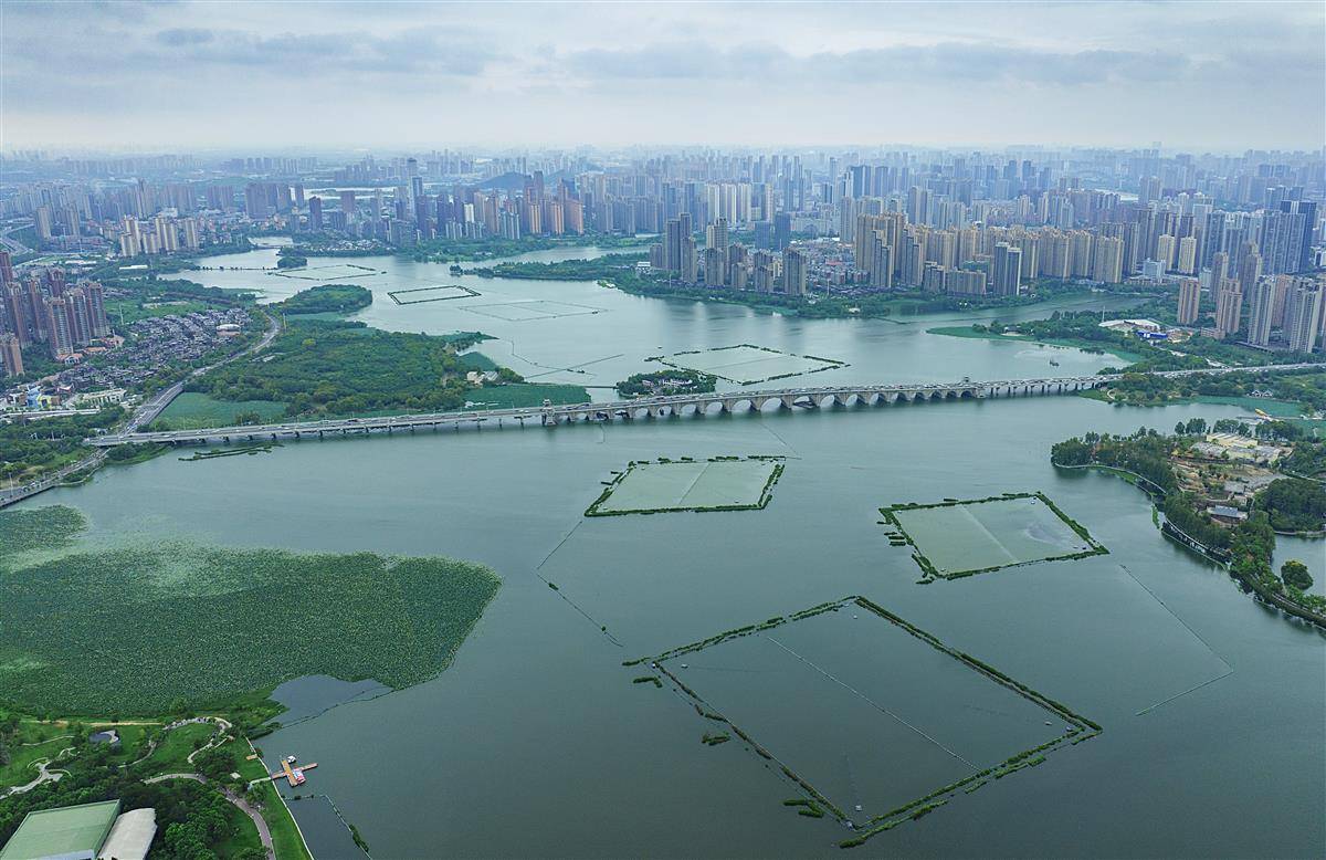 墨水湖水质曾多年处于劣Ⅴ类。2019年,墨水湖水体提质及生态修复工程(一期)启动,随着墨水湖新建的水质净化设备投入使用,以及建设水墨清华、桃花岛、七里庙等3个“生态塘”项目,通过种植水生植物,强化日常维护。目前,墨水湖水质整体为Ⅴ类,除磷以外指标基本达到Ⅳ类水标准,呈现出稳中向好的态势。(湖北日报全媒记者 朱熙勇 摄)