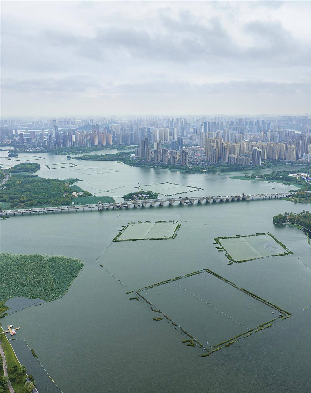 9月18日,鸟瞰武汉汉阳墨水湖生态修复工程,多个几何形的“生态塘”把湖面绘成一幅美丽的水墨画。
