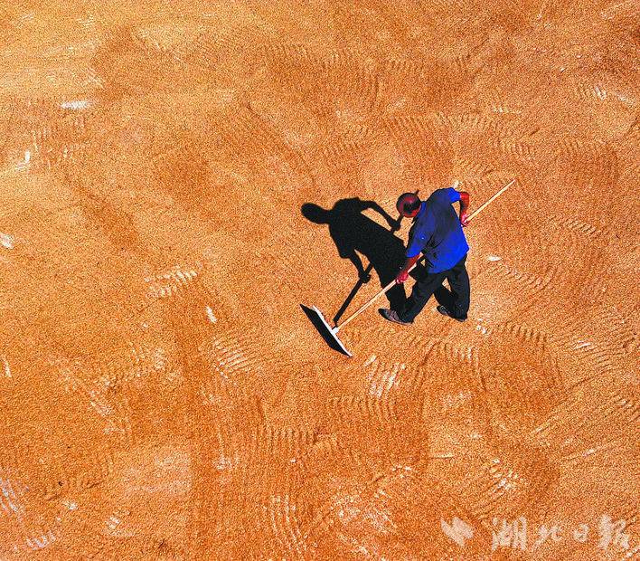 湖北日报客户端讯(通讯员焦国斌)9月15日,巴东县溪丘湾乡甘家坪村农家院坝里,村民翻晒金黄稻谷。