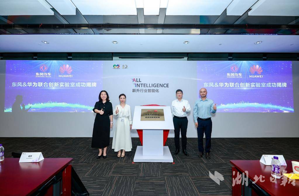在东风汽车科技创新管理部副总经理/研发总院副院长张衡、华为大企业与制造军团COO王致雅的共同见证下,东风汽车研发总院科技规划部总监韩杨、华为湖北政企业务副总经理杨莉分别代表双方为联合创新实验室揭牌。