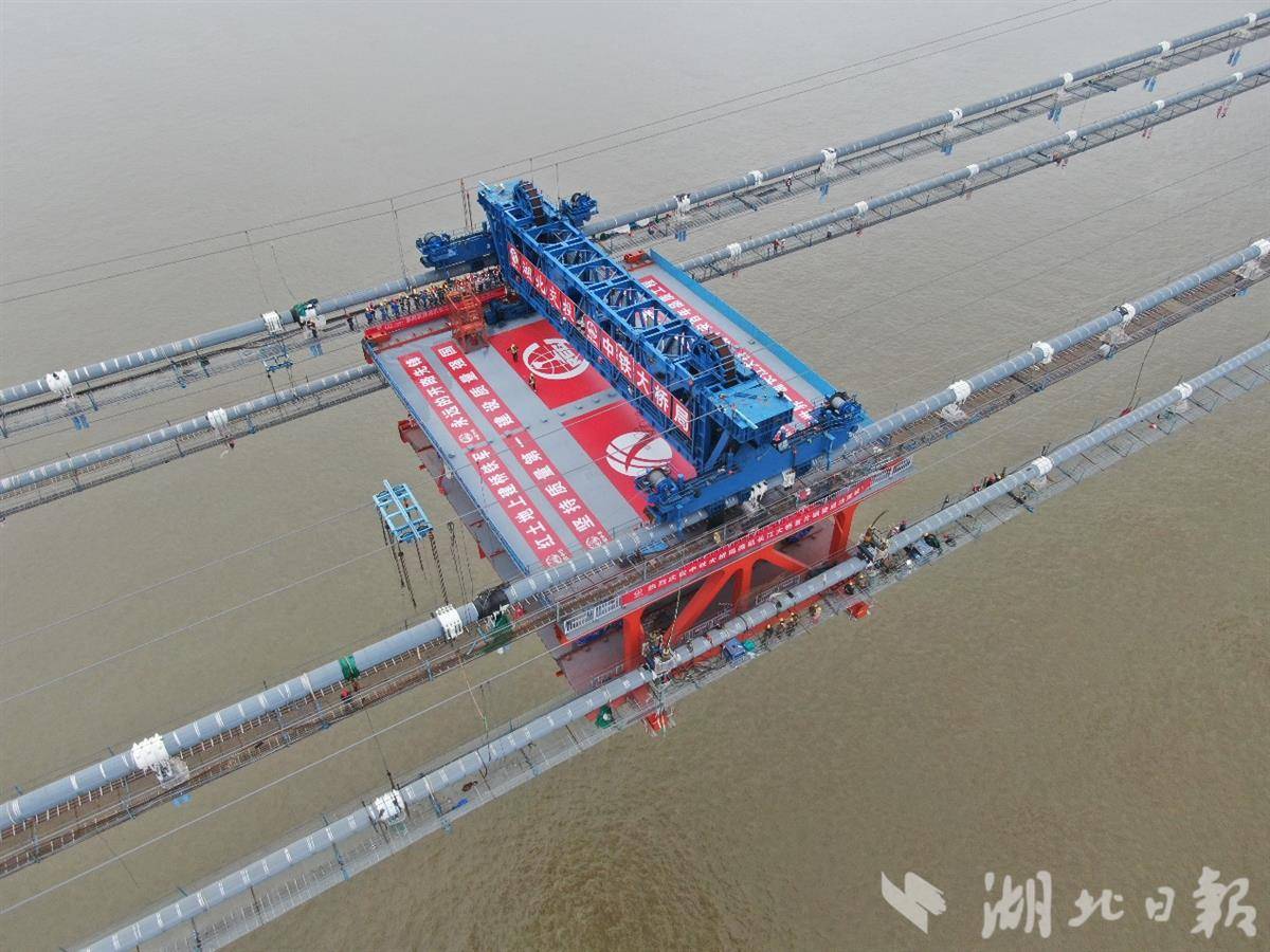 湖北日报讯 (通讯员詹航)9月20日,随着节段长28.4米、重830吨钢梁由900吨缆载吊机在江心缓缓提升至设计位置,燕矶长江大桥主跨首节钢梁吊装完成,标志着由中交二公院创新设计的世界首座大跨不同垂度四主缆悬索桥建设迈入钢梁架设阶段,代表着该院经过科学论证、创新设计的不同垂度四主缆悬索桥结构体系取得了工程实践意义,相关研究成果推动了悬索桥跨度向2000米乃至3000米级发展。