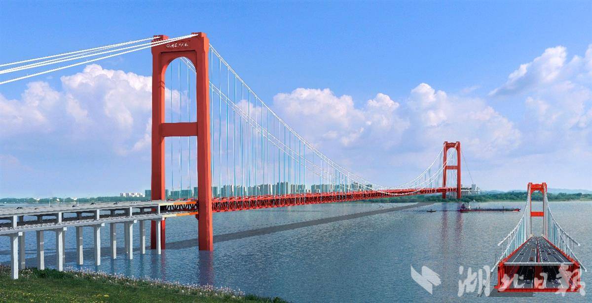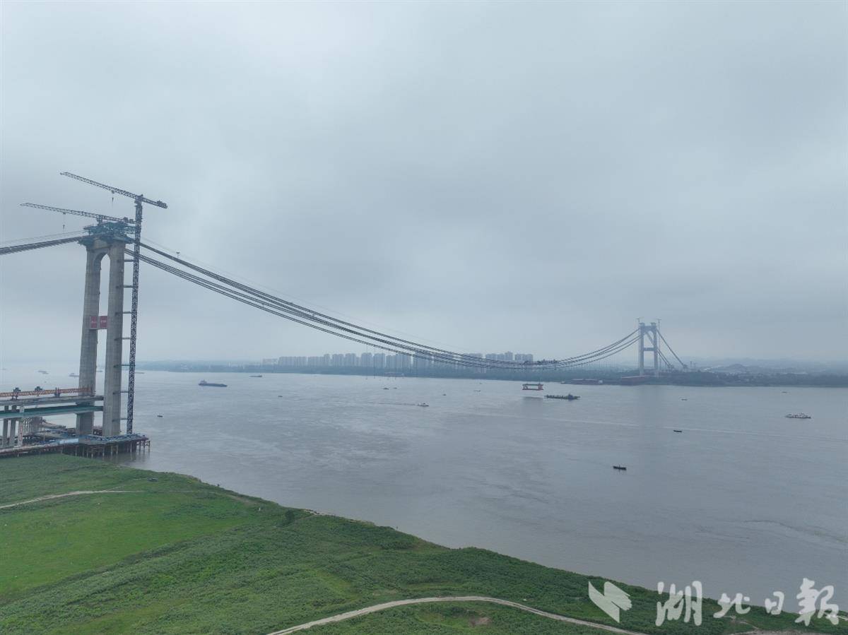 燕矶长江大桥受航空限塔高、通航限跨度、地质限塔位三个建设条件影响,大桥设计四根主缆、一跨过江,主跨达1860米,是我国首座大跨度四主缆悬索桥,同时也是世界首座不同垂度四主缆悬索桥。大桥上层设计为高速公路,下层为城市快速路,是鄂东空铁、空陆联运立体交通运输体系的重要过江通道,预计今年年底完成钢梁架设。大桥建成后,黄冈到鄂州花湖机场车程仅需15分钟,对完善湖北省高速公路网和过江通道布局,强化武鄂黄黄一体化发展具有重要意义。
